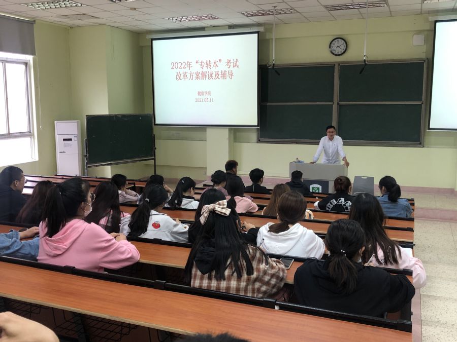 为进一步加强“专转本”学生学业支持,更好地服务学生升学考试,健康学院在前期调研的基础上于5月11日对2022届学生召开了“专转本”考试改革方案解读及辅导会。为了保证此次方案解读和辅导会的效果,健康学院精心筹备会议内容,重点从“专转本”选拔考试形式、报名条件、考试科目、考试大纲、考试内容等方面向学生详细解读了政策变化,认真听取了学生们提出的建议和意见,对学生们关心和疑惑的问题做出了详细解答,并为同学们提供了学习方法、时间分配、心态调整等方面的建议和参考。会后,学生们与老师们进行了长时间交流。