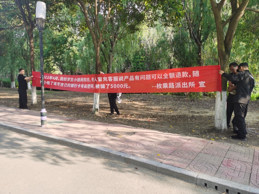 他们走近宿舍向学生发放了印有民警姓名和防骗知识的贴心卡片;在田径运动场向同学们耐心讲解防范电信网络诈骗知识,和同学们面对面进行了交流;在校园醒目位置上,悬挂了12条贴心通俗的防诈骗宣传横幅。为了积极配合这次专项活动,保卫处及时将发生在我校的典型诈骗案例通报到各学院,提醒广大师生加强防范;在各个学生公寓门口摆放宣传展板,张贴宣传海报,校园电子大屏幕滚动播放防诈骗案例。通过以上一系列的反诈骗宣传,广大师生安全防范意识显著提升,近一周以来校园电信网络诈骗实现了零发案,防诈骗工作取得明显成效。