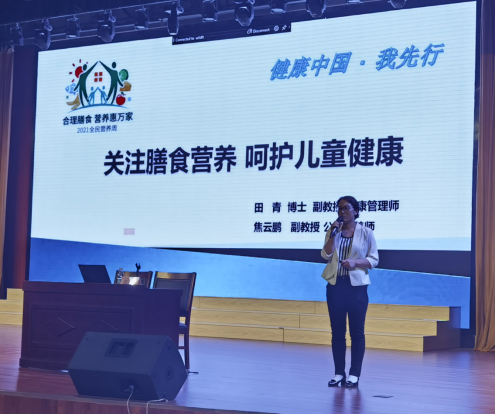 食品学院的学生们首先给家长献上了活力四射的营养健康操,欢快的节奏和充满激情的演绎,把乐观向上,充满朝气,运动健体的精神传递给了家长们,会场气氛达到了高潮。接着,田青老师给大家进行了一场图文并茂,深入浅出的营养宣讲。从详细介绍中国居民膳食宝塔、中国居民平衡膳食餐盘、中国儿童平衡膳食算盘的内容到指导家长运用五指法搭配全日均衡膳食、三分法搭配一餐均衡膳食,再通过案例点评和家长互动检验家长听讲效率,纠正大家错误的营养认知;教会大家计算自己的体质指数,并号召大家科学运动,做到吃动平衡,保持健康体重。整个过程家长们都在认真听讲,不断记录并积极参与互动。最后,学生们为家长们发放了营养宣教的小册子并对相关内容进行解读,便于家长在会后深入的学习和掌握膳食营养方面的知识。