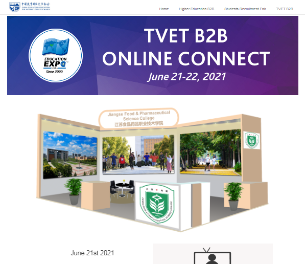6月21日,我校参加2021中国国际教育展活动。本次线上展采用全英文平台展示和直播,作为首批高职院校参展代表之一,我校在展会上展示学校,并开展线上直播与洽谈。