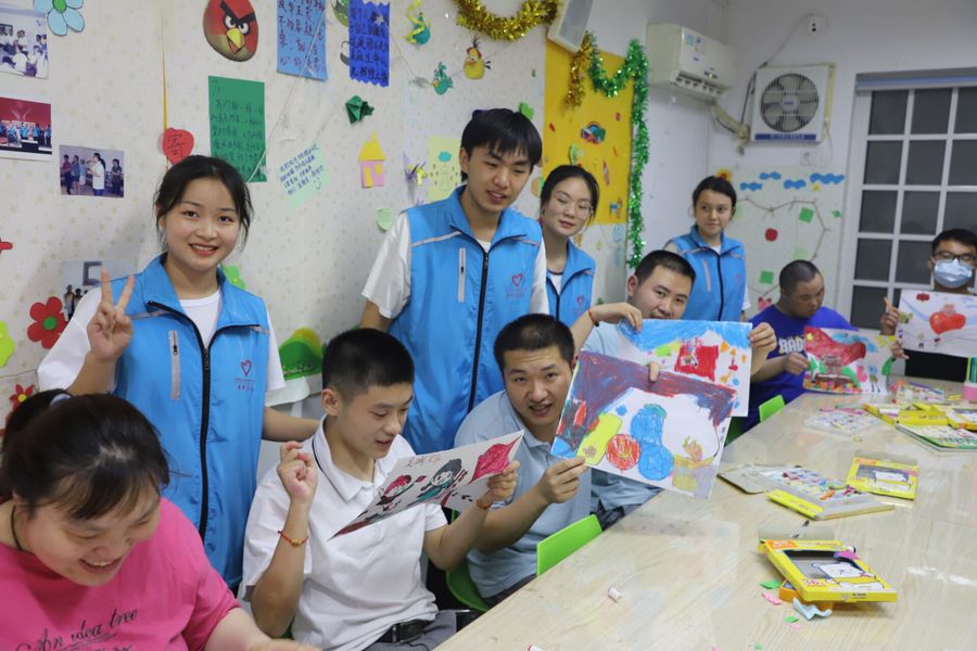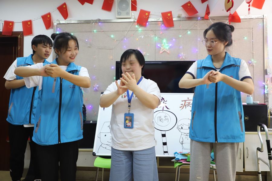 首先,志愿者与残障人士共同制作夏日清凉饮品酸梅汤,同时与他们开展了爱国主题手绘、红色故事分享、折纸、疫情防控注意事项和七步洗手法等一系列丰富多彩的活动;随后,志愿者们为他们带来了精彩的文艺节目,如爱国手势舞、新疆舞等,合唱《我和我的祖国》、《奔跑》、《追梦赤子心》将此次活动推向高潮;最后,志愿者们为他们送去了手持小风扇,一起感受夏日的清凉时刻。