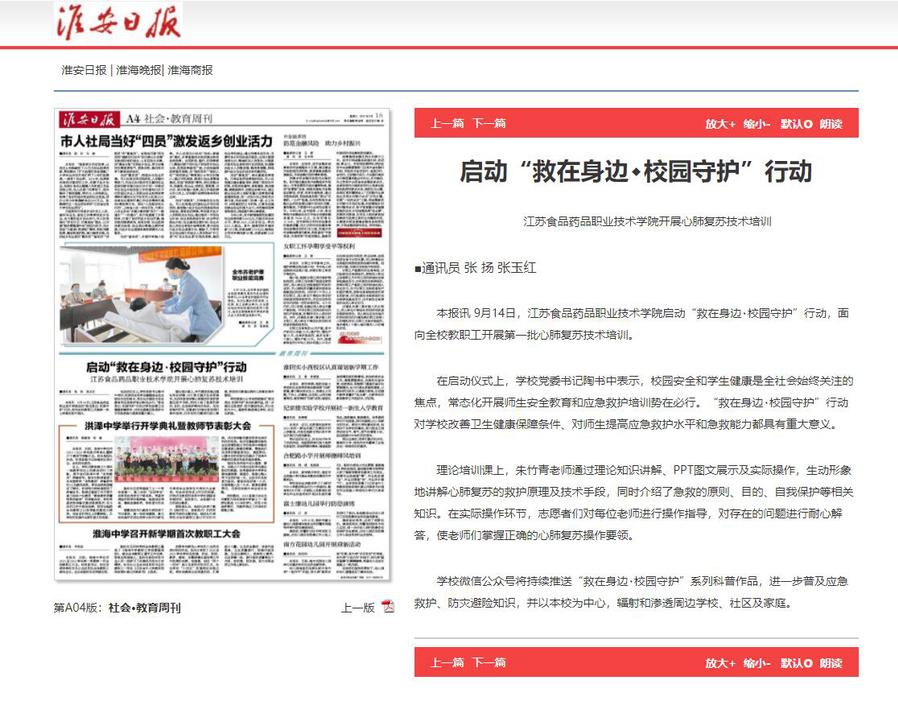 9月14日,江苏食品药品职业技术学院启动“救在身边۰校园守护”行动,面向全校教职工开展第一批心肺复苏技术培训。