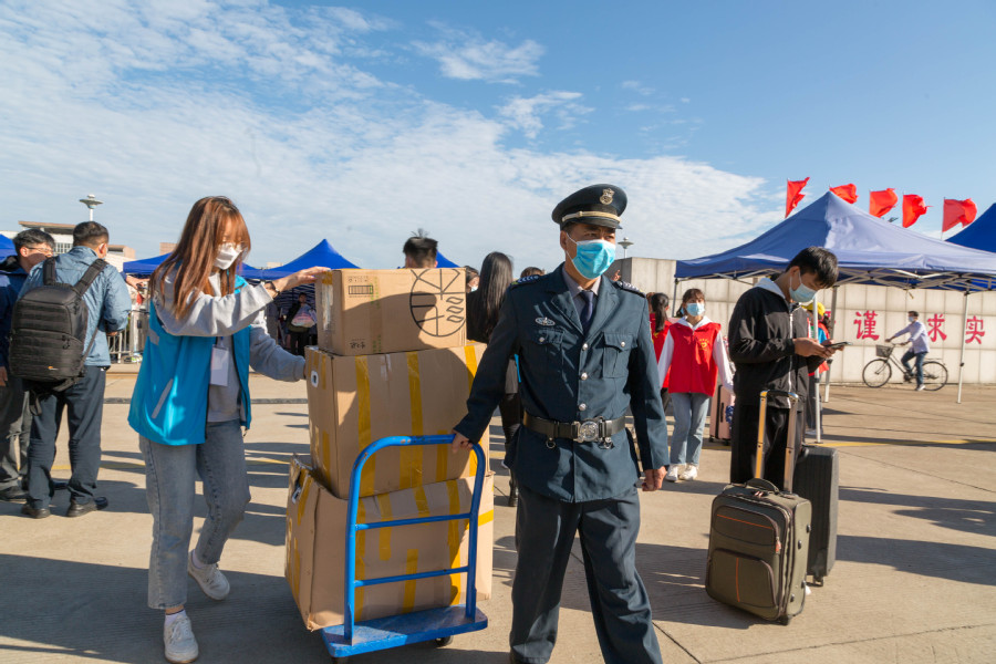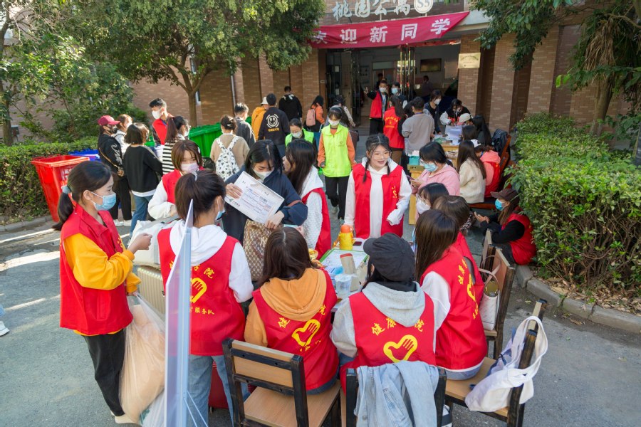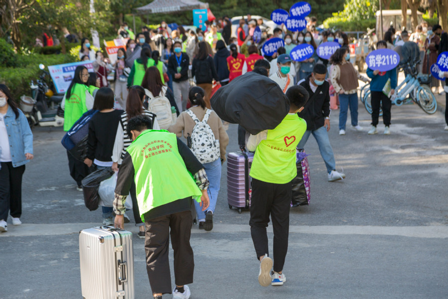 为使新生有秩序、有效率的完成开学报道工作,学校不仅提前安排了接送车辆,还调用了大量保安人员、师生志愿者团队,协助新生搬运行李。校内校外都设置了新生接待点,身穿红绿马甲的志愿者们更是早在6点前就已整装到岗,随时准备迎接新生。志愿者药剂204戴宁说:“高铁站、飞机场、汽车站、学校大门口、宿舍楼......只要有新同学的地方,就有我们志愿者们匆忙的身影。”康复201张凌云表示:“虽然要克服早起,但是去年我也是因为学长学姐的帮助才能更快安顿下来,这样的接力理应成为传统,于是我和我的同学们都来了!”新生的到来让他们虽忙碌但快乐着,接送车辆上“我为同学办实事”的横幅充分表达着青年一代的努力和担当。“刚进校就有学长学姐在各个地方为我们指引、搬运行李、介绍校园,感受到了学校的人文关怀和热情,很暖心!”财务211班的新生姜睿婧这样表示道。