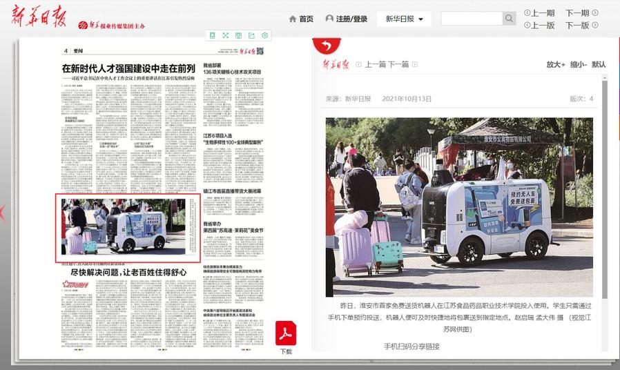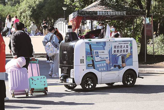 昨日,淮安市首家免费送货机器人在江苏食品药品职业技术学院投入使用。学生只需通过手机下单预约投送,机器人便可及时快捷地将包裹送到指定地点。