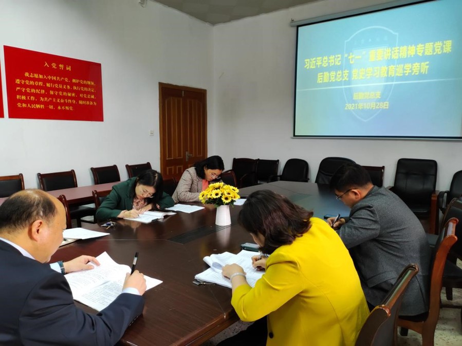 党课结束后,安进认真听取了各总支委员学习“七一”讲话的心得体会,以及信息工程学院党总支副书记刘玲、后勤党总支书记李金霞对“两在两同”建新功、“学党史 办实事”相关工作开展情况的汇报。安进充分肯定了各总支的特色和亮点工作,同时提出了严格的要求和殷切的期望。他指出,在目前高强度的工作中,要紧密结合部门实际,聚焦发展过程中的突出短板问题,积极寻找破解难题的方法,以师生为中心、以立德树人为根本任务,确保学习教育与中心工作和服务师生同频共振。