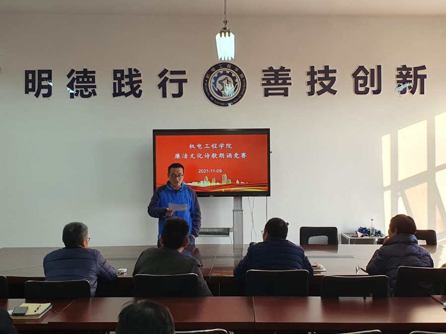 为加强机电学院党总支对于全体师生党员廉洁文化教育,进一步弘扬廉政文化主旋律,传播拒腐防变廉声音,11月9日下午,机电工程学院在会议室举行廉洁文化诗歌朗诵大赛。机电学院刘碧俊、高士杰、张学峰、谢亚青、施华等老师担任评委。