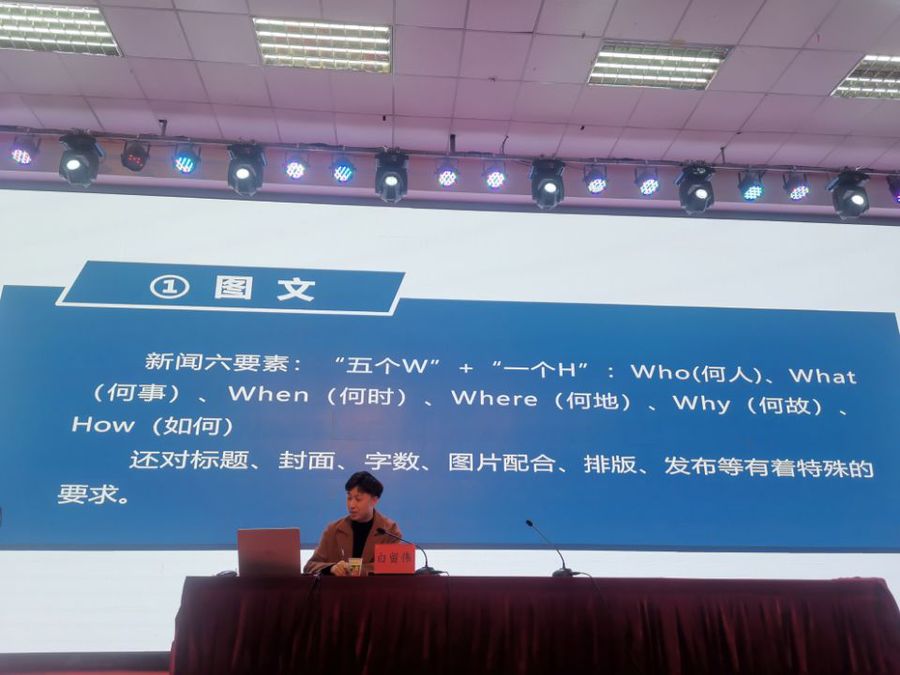 第二讲邀请淮安日报社网端编辑负责人、团委书记白留伟,他分别从新媒体发展现状、新媒体发展产品类别以及新媒体平台运营这三个方面进行深度的剖析。对新闻稿的撰写、视频的拍摄进行了详细介绍,并通过举例说明的形式,列举出不同类型的新闻稿模板,以强调每部分的不同写法和注意事项,并希望在座的同学都能够有所收获,能对新闻稿的撰写、图片的拍摄和选择有更加全面的认识。