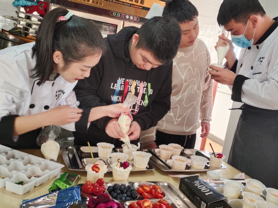 来到托养中心,托养中心周美荣主任介绍了中心主要的工作内容,并耐心解答同学们提出的问题。为了让中心学员们顺利完成裱花制作,老师和同学们化身为“哥哥姐姐”,采取“一对一”的方式,面带笑容,耐心解答,用掌声给予他们鼓励,协助他们理解并完成裱花制作。中心学员们认真努力,自己尝试完成每一步骤的装点。他们首先用不同型号的裱花嘴装点出各种花色;随后在奶油上装饰巧克力、水果、饼干、糖果等;最后互相进行展示和交流分享,现场热情不减,其乐融融。他们高兴地表示,没想到自己也能做出这么漂亮的蛋糕,增强了他们自尊、自爱、自强、自立的信心。