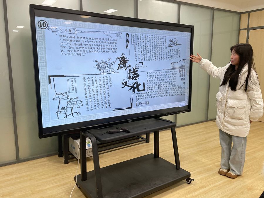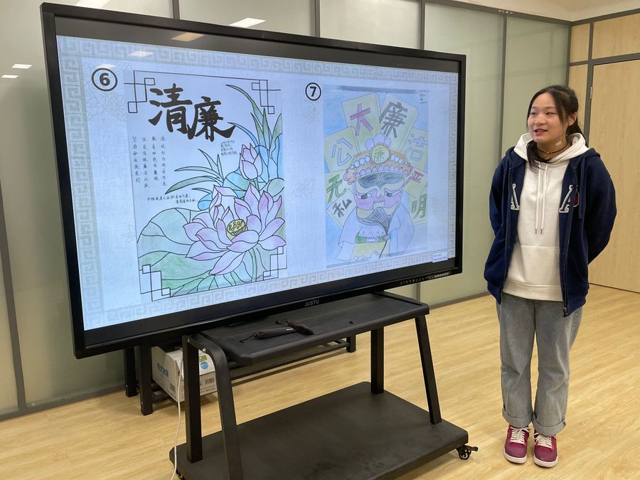 本次活动旨在廉洁文化与立德树人有机融合,以中华优秀传统文化涵养廉洁文化,以革命文化升华廉洁文化,发挥文化浸润心灵的作用。同学们形象生动的介绍自己的作品,并讲述了历史中广为流传的羊续悬鱼、陶母退鱼、于谦拒礼等廉洁故事,多个故事角度不同,多角度诠释了廉洁的丰富内涵。