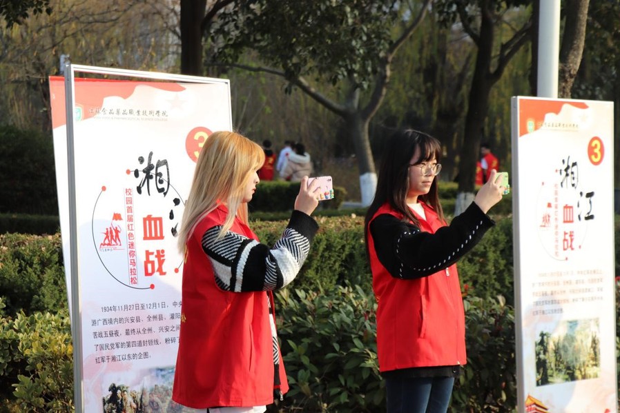 “血战湘江”“遵义会议”“巧渡金沙江”“飞夺泸定桥”“激战腊子口”等这些长征期间的重要事件被分别设置成十一个不同的打卡点分布在红色迷你马拉松的路途中。参赛师生们在志愿者们的引导下,按照路线顺序在打卡点合影,在奔跑中学习党史。终点是标注了象征长征胜利的“会宁会师”,让师生选手们 “沉浸式”体验了红军长征的艰难险阻,学习伟大长征精神,并在党史学习中汲取精神力量、铭记党的光辉历史、传承红色基因。