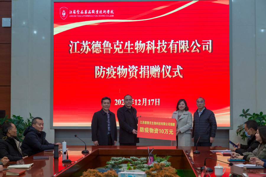 12月17日下午,江苏德鲁克生物科技有限公司副总经理戴恩峰代表董事长、总经理徐荣向我校再次捐赠10万元防疫物资。我校党委书记陶书中、党委委员、组织部长周耀明出席捐赠仪式。