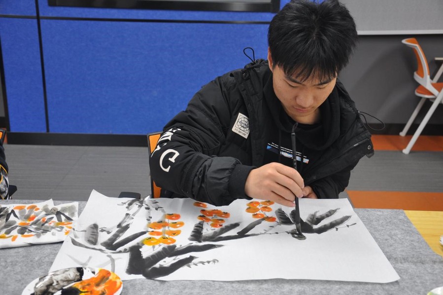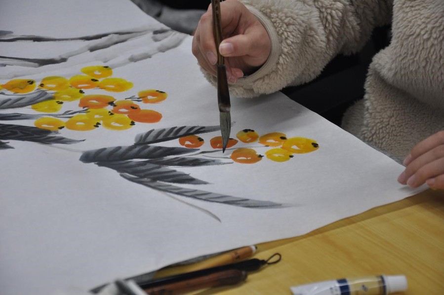 本次活动主持人盛丹丹运用PPT展示中国画作品,让学生感受“水墨”之美,激发学生了解和学习中国画的热情,接着介绍作画材料:笔、墨、纸、砚,并展示花鸟画画家吴昌硕作品,以此作为临摹范本,分步骤进行教学示范并讲解技法要点,随后学生进行临摹实践、作品分享和感悟交流,最后活动主持人进行点评。