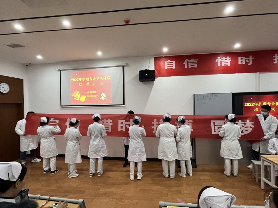 为帮助2022届护生在护士执业资格考试中取得理想成绩,2月7日上午,护理学院在护理实训中心开展“自信 惜时 拼搏 圆梦——奋战七十六 赢得百分百”为主题的2022年护考辅导动员大会,启动为期76天的护士执业资格考试的线下辅导工作,外聘教师代表淮阴区妇幼保健院护理部主任包玉梅参加了大会。