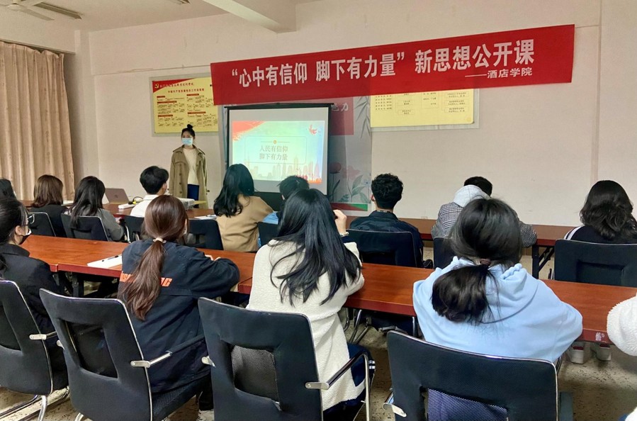 为进一步组织引导广大青年学生深入学习贯彻习近平新时代中国特色社会主义思想和共青团十八届六中全会精神,加强共青团思想政治引领工作,树立坚定的理想信念,2022年3月10日晚酒店学院开展“心中有信仰,脚下有力量”新思想公开课,高铁213班李妍同学担任主讲人。
