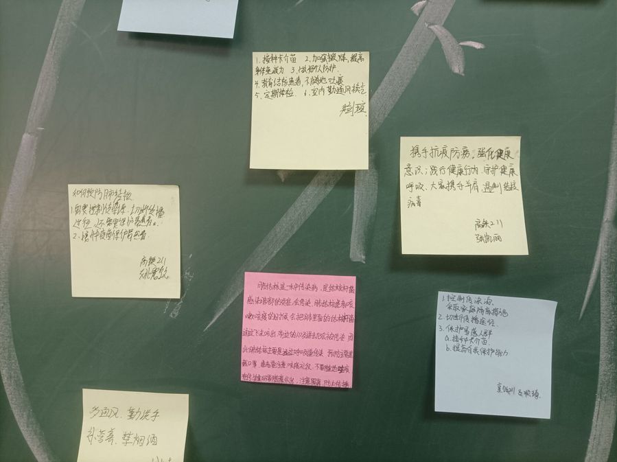 因疫情防控要求,本次活动由酒店学院自管会学生干部通过腾讯会议在线进行,活动共分为结核病防治日简史介绍、结核病防治知识科普、结核病预防标语征集、结核病患者营养食谱分享四个部分。在普及结核病防治知识的基础上,结合所学专业知识,与大家分享结核病患者食谱及菜肴的烹饪方式。系列营养食谱的讲解,让大家意识到防治结核病,应从日常的科学饮食做起。活动结束后,各班委代表在便笺上写下了本次活动的学习心得、预防肺结核的注意事项、宣传标语等,组成了一道美丽的科普墙。