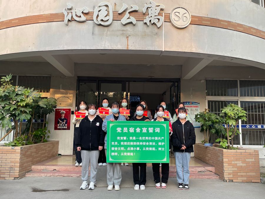 下午,王涛济、张芹等一行走访了学生党员宿舍,为学生党员讲解了党员宿舍挂牌的意义。“党员宿舍挂牌”就是为了亮明党员身份,坚守党员责任,牢记党的宗旨,体现党员先进性,并充分发挥党员的榜样作用与模范带头作用。”随后,书记与辅导员们分别为党员宿舍一一挂牌,党员同学面对党员宿舍门牌庄严宣誓。学生党员高欣妍表示:“党员宿舍挂牌使学生党员亮出自己的身份,挂牌就是一面旗帜,督促自己以身示范,从学习到工作,从宿舍到班级,创先争优,不断进步。”最后,在老师的带领下,学生党员积极向同学们讲解疫情防控知识并发放宣传海报,充分运用专业知识和实际行动,带领同学们提高疫情防控知识。