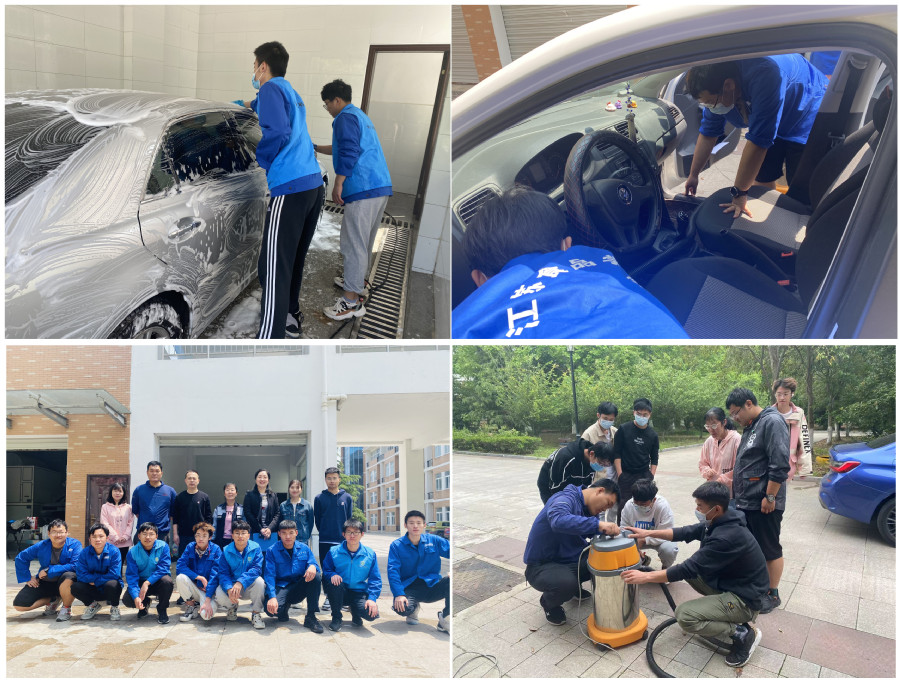 前来洗车的车辆络绎不绝。8名洗车志愿学生身着实训服,按照分工开始劳动,有的负责冲洗,有的负责擦洗,有的负责清理内饰,洗车程序有条不紊。