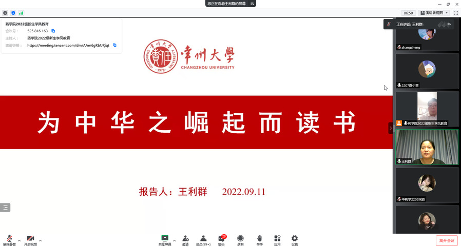 9月18日晚,药学院组织2022级新生开展学风建设教育,邀请常州大学药学院党委书记王利群教授担任主讲人,药学院副院长葛驰宇主持讲座,2022级全体新生聆听了讲座。