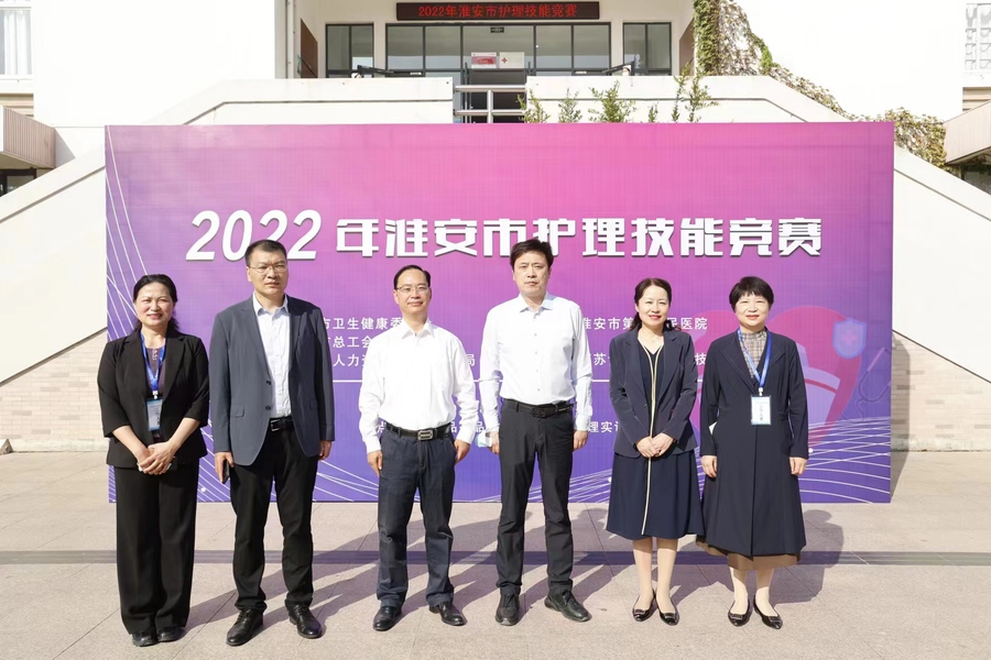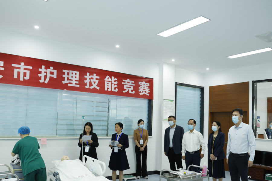 9月28日至9月29日,由淮安市卫生健康委、市总工会、市人力资源和社会保障局联合主办,淮安市第二人民医院承办,江苏食品药品职业技术学院协办的2022年淮安市护理技能竞赛活动在苏食院护理实训中心举行,来自各县区卫健委、市直各医院16支代表队参加了竞赛。我校校长薛宇陪同淮安市卫健委党委书记、主任郑东辉,市第二人民医院党委书记吉雅玲、副院长徐永到竞赛现场指导。