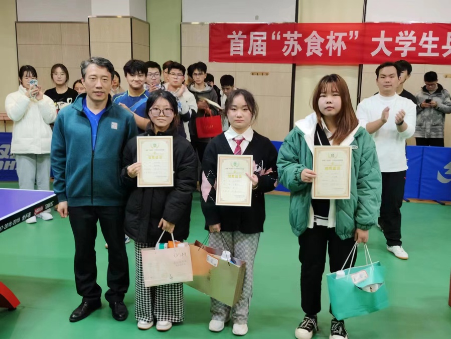 12月9日,体育教学部主办的2022年首届“苏食杯”大学生乒乓球比赛在大活中心乒乓球馆落下帷幕。本次比赛分为团体,单打两个项目。比赛在众多势均力敌的参赛运动员之间进行,这样也使比赛更加精彩,直拍、横拍、扣球、旋转球、弧圈球等都得到了体现。比赛中不时传出热烈的喝彩声。短短一天里,运动员们志高气盛,振衣贯弓,用优异的成绩给刻苦的训练画上圆满的句号。药学院、食品学院、酒店学院分别获得冠、亚、季军。校领导党委书记陶书中、副校长贾韶千分别为获得比赛前三名的远动员颁奖。