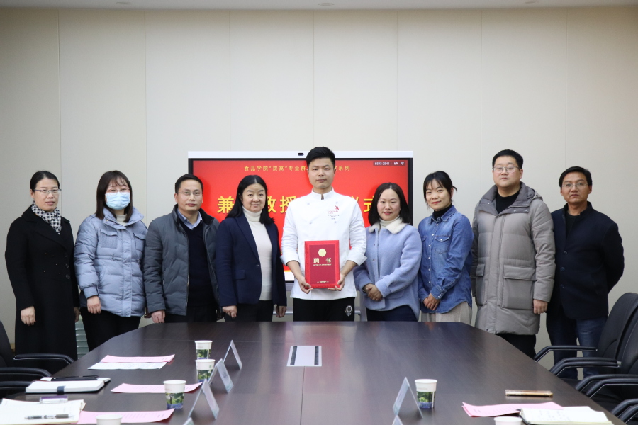 食品学院院长李琴介绍了蔡叶昭教授的基本情况和个人成就。蔡叶昭教授曾获第44届世界技能大赛烘焙项目的世界冠军,被江苏省政府记个人一等功并授予“江苏大工匠”称号。人事处处长丁正亚介绍了我校人才引进政策及相关管理办法,并代表我校解释了兼职教授的聘任要求,希望蔡叶昭教授能与我校深度合作,提升教学创新团队综合实力。