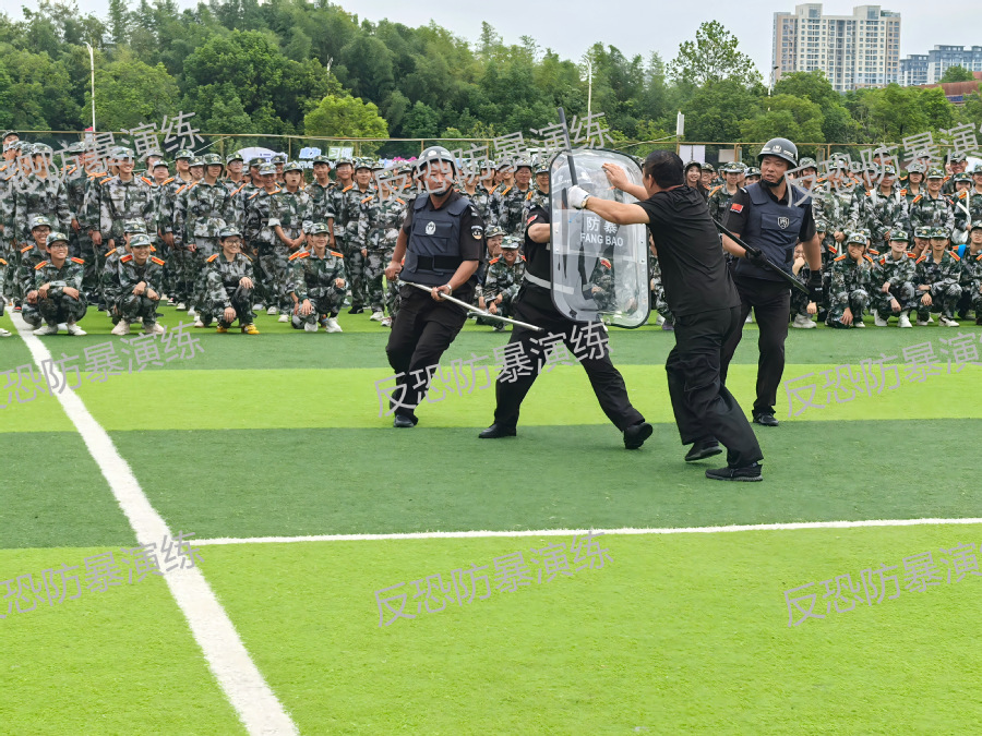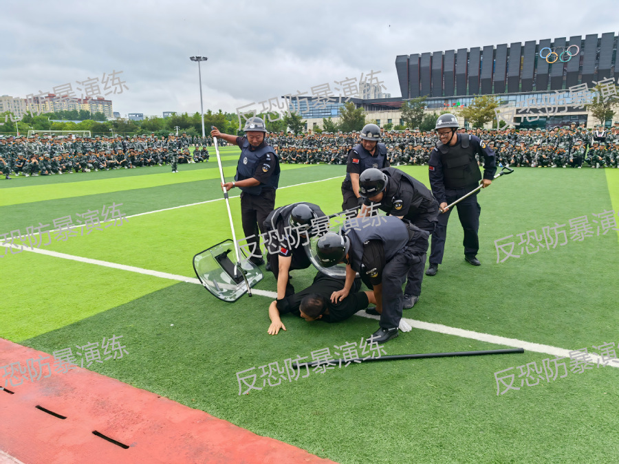 9月26日下午,保卫处在学校田径场组织校园反恐防暴演练,保卫处保安员参加了演练,军训教官和部分新生现场观摩了演练。
