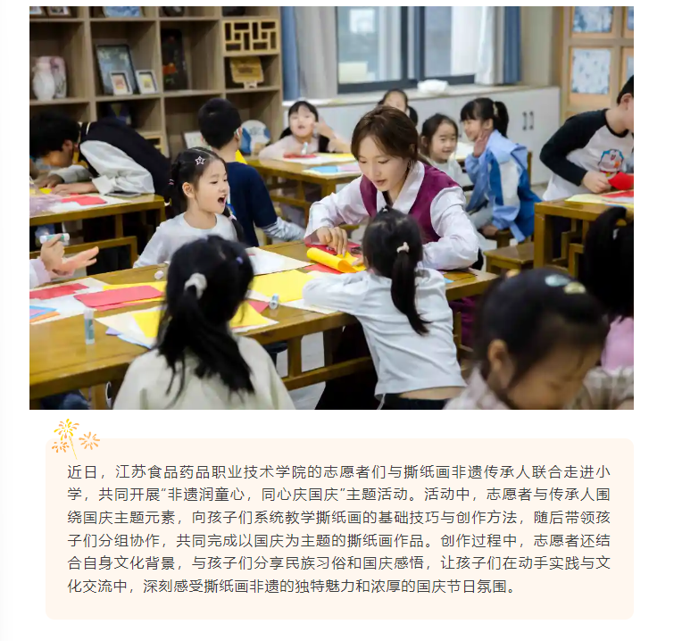 近日,江苏食品药品职业技术学院的志愿者们与撕纸画非遗传承人联合走进小学,共同开展“非遗润童心,同心庆国庆”主题活动。活动中,志愿者与传承人围绕国庆主题元素,向孩子们系统教学撕纸画的基础技巧与创作方法,随后带领孩子们分组协作,共同完成以国庆为主题的撕纸画作品。创作过程中,志愿者还结合自身文化背景,与孩子们分享民族习俗和国庆感悟,让孩子们在动手实践与文化交流中,深刻感受撕纸画非遗的独特魅力和浓厚的国庆节日氛围。