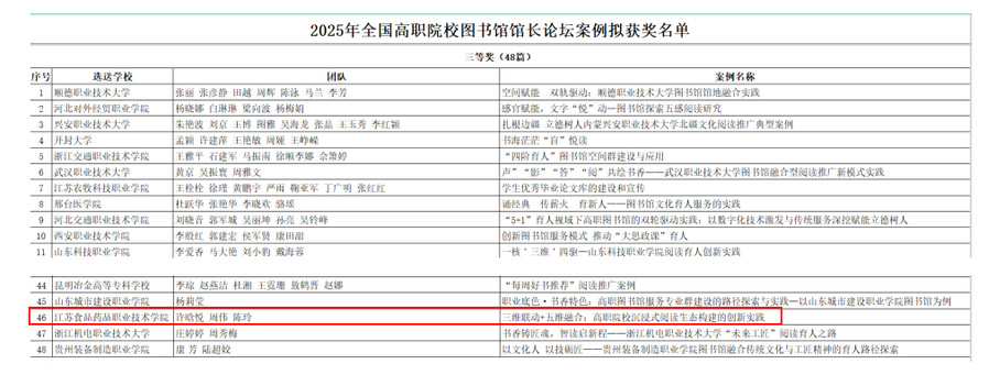 近日,由教育部高等学校图书情报工作指导委员会、高职高专院校分委员会主办的“2025年全国高职高专院校图书馆案例、论文征集评选活动”结果正式揭晓。本次活动吸引了来自全国98所高职院校及行业单位的广泛参与,竞争激烈,共征集到案例139个、论文190篇。经过权威专家的严格评审,我校图书馆许晗悦、周伟、陈玲老师提交的案例作品《三维联动·五维融合高职院校沉浸式阅读生态构建的创新实践》荣获“案例类三等奖”!