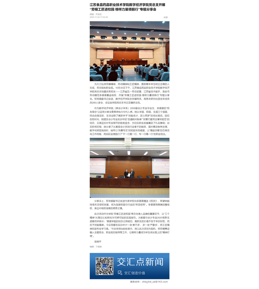 为大力弘扬劳模精神、劳动精神和工匠精神,激励青年学生树立正确的人生观、劳动观和职业观,10月30日下午,江苏食品药品职业技术学院数字经济学院党总支特邀优秀校友——江苏省五一劳动奖章、江苏省技术能手、淮安市劳动模范李蓓蓓重返母校,开展“劳模工匠进校园 榜样力量领前行”专题分享会。校党委副书记安进、数字经济学院全体辅导员、周恩来研究社团全体成员共280人参会,会议由学院党总支书记王婧妍主持。