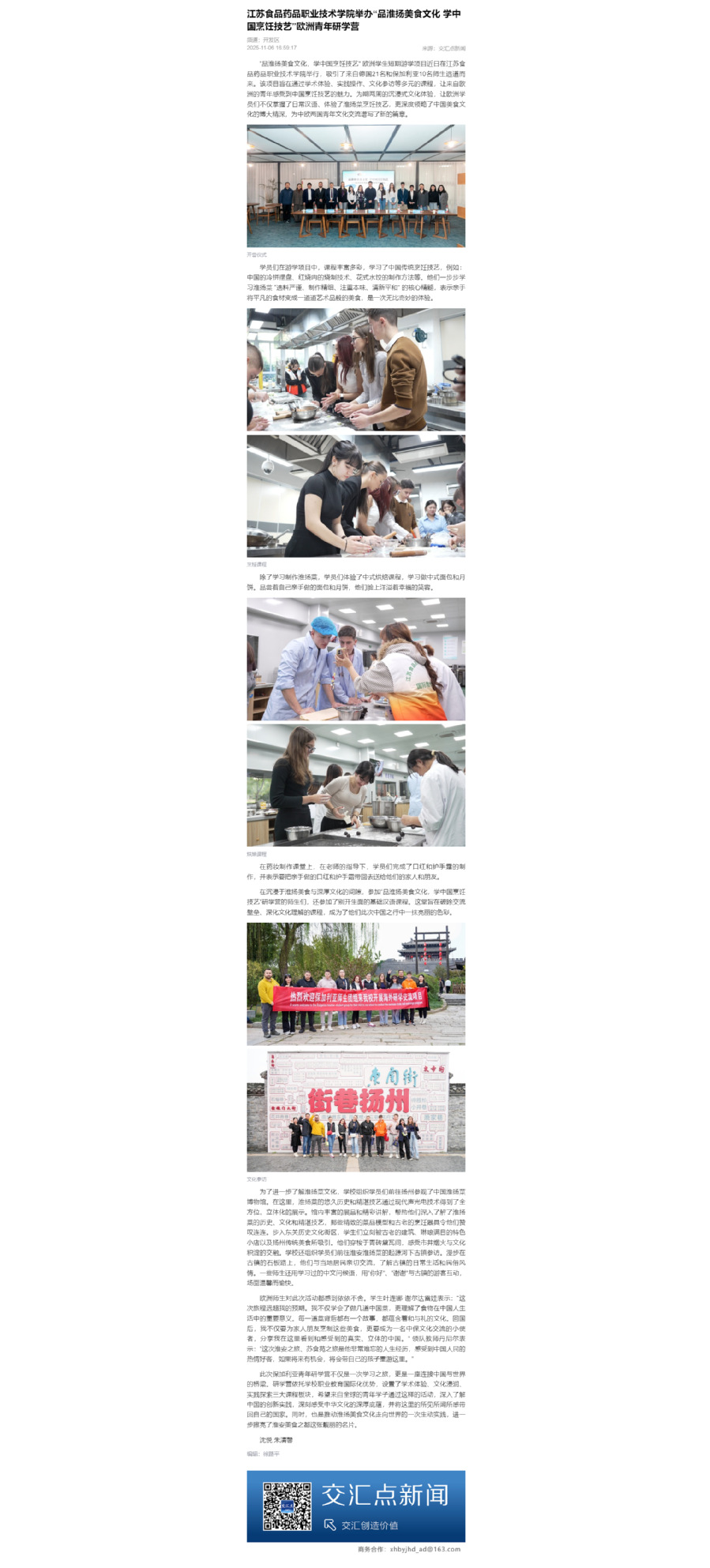 “品淮扬美食文化,学中国烹饪技艺” 欧洲学生短期游学项目近日在江苏食品药品职业技术学院举行,吸引了来自德国21名和保加利亚10名师生远道而来。该项目旨在通过学术体验、实践操作、文化参访等多元的课程,让来自欧洲的青年感受到中国烹饪技艺的魅力。为期两周的沉浸式文化体验,让欧洲学员们不仅掌握了日常汉语、体验了淮扬菜烹饪技艺,更深度领略了中国美食文化的博大精深,为中欧两国青年文化交流谱写了新的篇章。