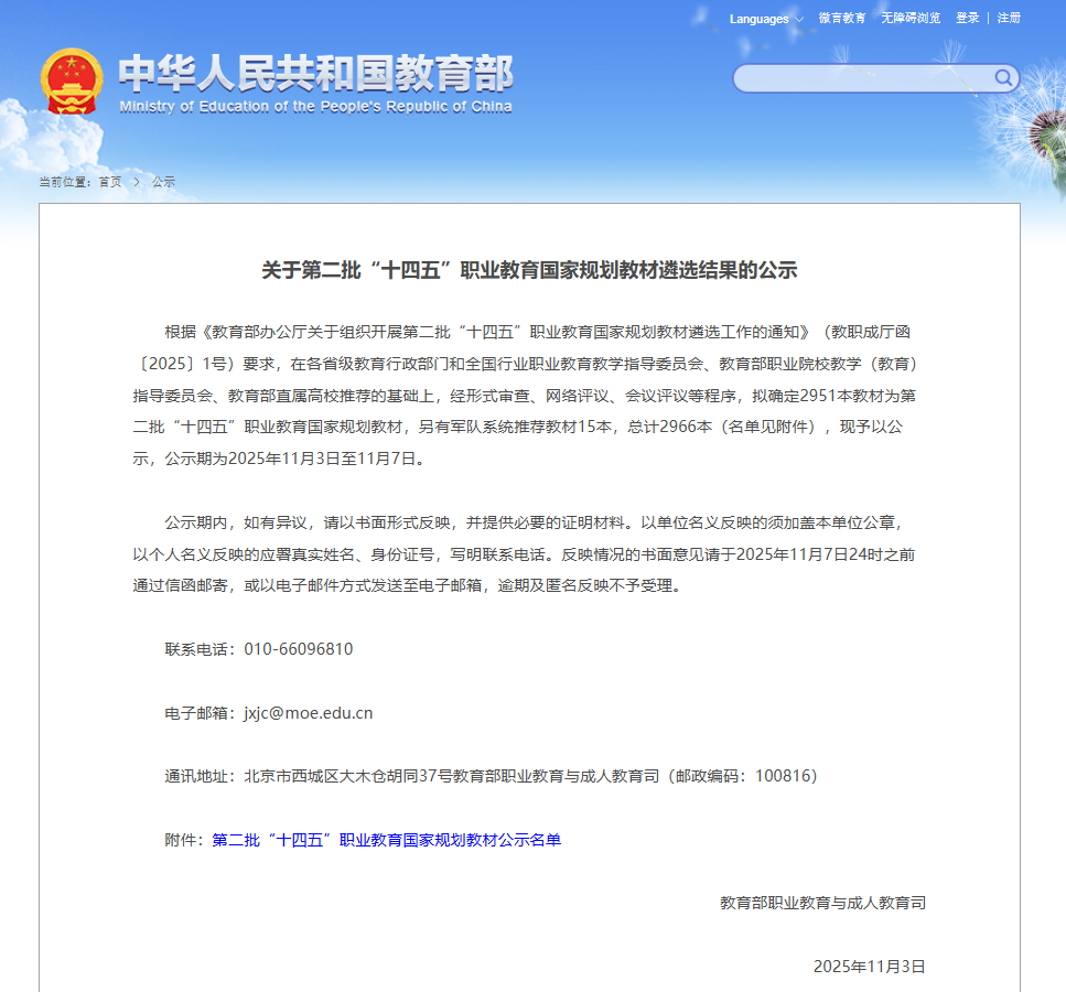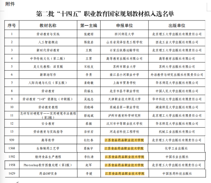 近日,教育部办公厅公布了第二批“十四五”职业教育国家规划教材遴选结果,我校《高等数学》(第一主编:杜红春)、《生物制药工艺学》(第一主编:葛驰宇)、《焙烤食品生产教程》(第一主编:李红涛)、《药品GMP实务》(第一主编:李媛)、《Photoshop数字图像处理(第2版)》(第一主编:赵军)共5本教材拟入选。
