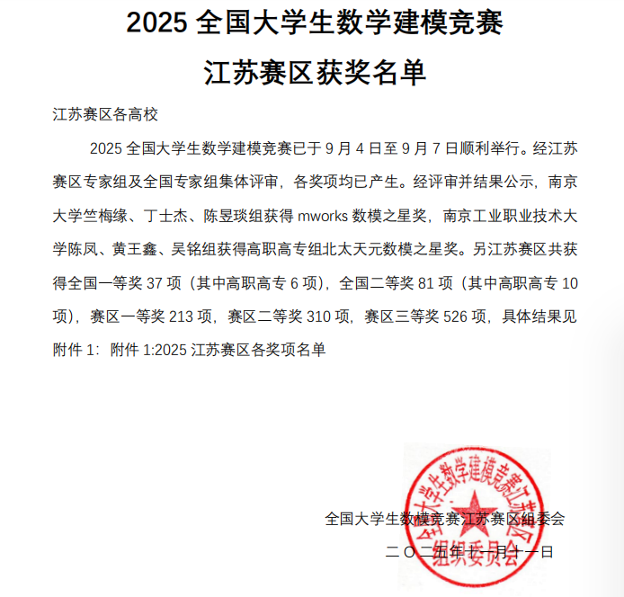 全国大学生数学建模竞赛创办于1992年,是教育部认可的高级别A类学科竞赛之一,也是首批列入“高校学科竞赛排行榜”的19项竞赛之一。竞赛每年9月举办,全国统一命题,赛题来源于实际问题,参赛团队需在3天时间内建立数学模型解决问题并完成论文。该竞赛旨在提升学生数学应用能力、创新精神与团队协作能力。本次全国大学生数学建模竞赛江苏赛区共有135所学校、4312支队伍报名参赛。由陈贤老师指导,刘文宇、刘志阳、杨绍真三位同学组成的学校代表队凭借清晰的建模思路、严谨的数据分析和出色的论文撰写,夺得省级一等奖。