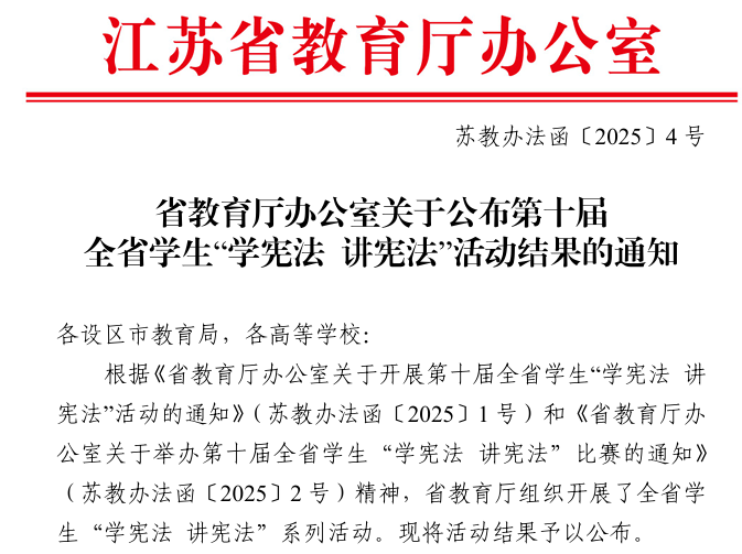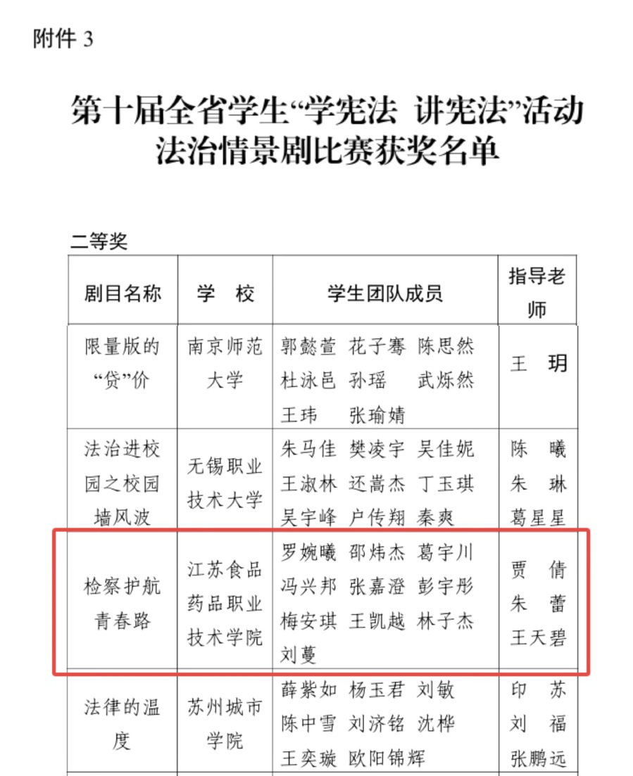 根据《省教育厅办公室关于公布第十届全省学生“学宪法讲宪法”活动结果的通知》(苏教办法函〔2025〕4号),药学院学生团队倾力演绎的法治情景剧《检察护航青春路》,凭借深刻的法治内涵、生动的剧情呈现与扎实的表现功底,在众多参赛作品中脱颖而出,荣获江苏省第十届“学宪法讲宪法”法治情景剧比赛二等奖。