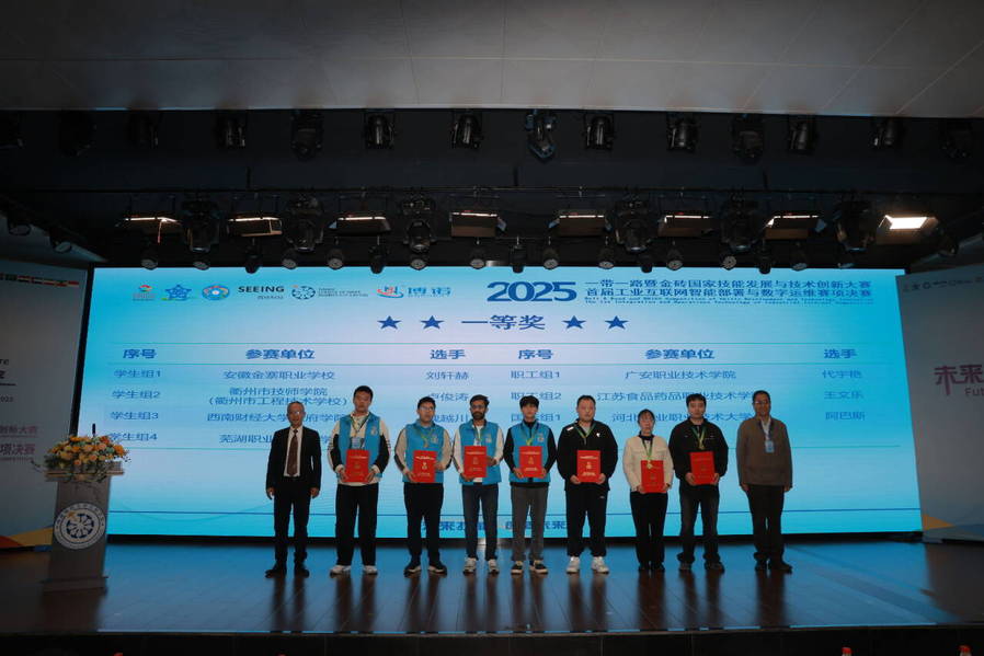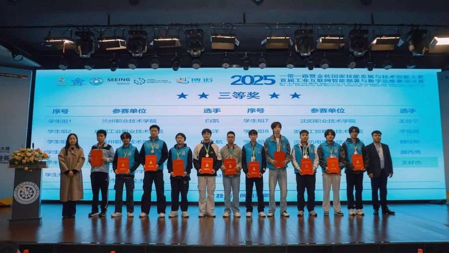 11月10日,2025“一带一路”暨金砖国家技能发展与技术创新大赛首届工业互联网智能部署与数字运维赛项决赛在四川绵阳西南财经大学天府学院圆满落幕。我校职工组选手王文乐凭借精准技术部署与高效问题处置能力,在理论考核与实操竞技中脱颖而出,斩获职工组一等奖,成功晋级2026年4-5月在北非摩洛哥卡萨布兰卡举办的国际总决赛,且学校获得了优秀组织奖;学生组选手吴嘉庆(指导教师王文乐)协同攻坚、沉着应对复杂任务,拿下学生组三等奖。