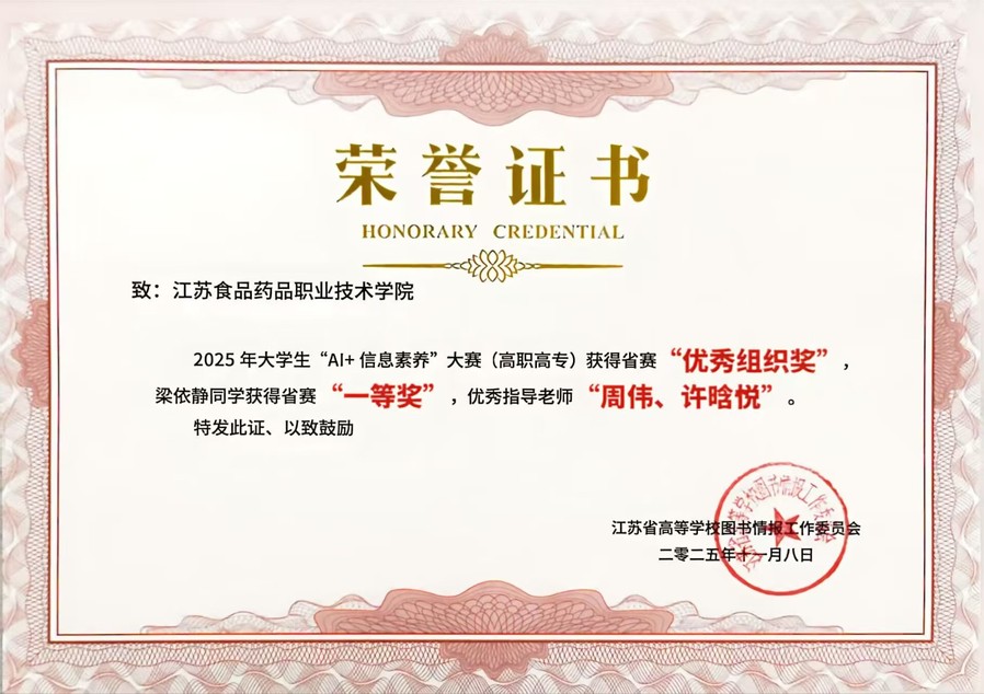 2025年大学生“AI+信息素养”大赛圆满结束,本次大赛由教育部高等学校图书情报工作指导委员会高职高专院校分委员会指导、2025年大学生“AI+信息素养”大赛组委会主办。我校药本241班学生梁依静获江苏省一等奖,图书馆周伟、许晗悦获“优秀指导老师”称号,我校获得“最佳组织奖”。