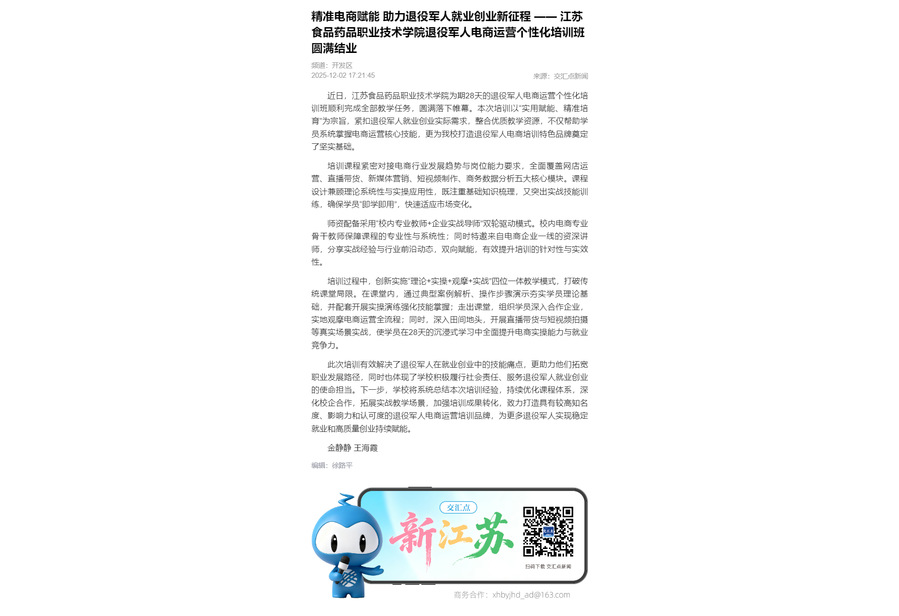 近日,江苏食品药品职业技术学院为期28天的退役军人电商运营个性化培训班顺利完成全部教学任务,圆满落下帷幕。本次培训以“实用赋能、精准培育”为宗旨,紧扣退役军人就业创业实际需求,整合优质教学资源,不仅帮助学员系统掌握电商运营核心技能,更为我校打造退役军人电商培训特色品牌奠定了坚实基础。