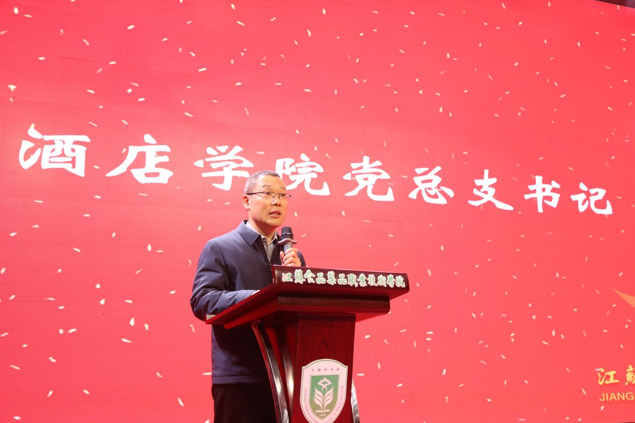 酒店学院党总支书记拾以超首先致辞。他代表学院党总支向全体新生表示热烈祝贺,并深刻阐述了身着制服所承载的深厚意义。他指出,制服不仅是专业身份的外在标志,更是职业荣誉、责任担当与匠心传承的象征。他勉励同学们以“厨德为本、技艺为魂”为准则,在传承中创新,在磨砺中成长,淬炼出属于新时代烹饪人的精神品格。