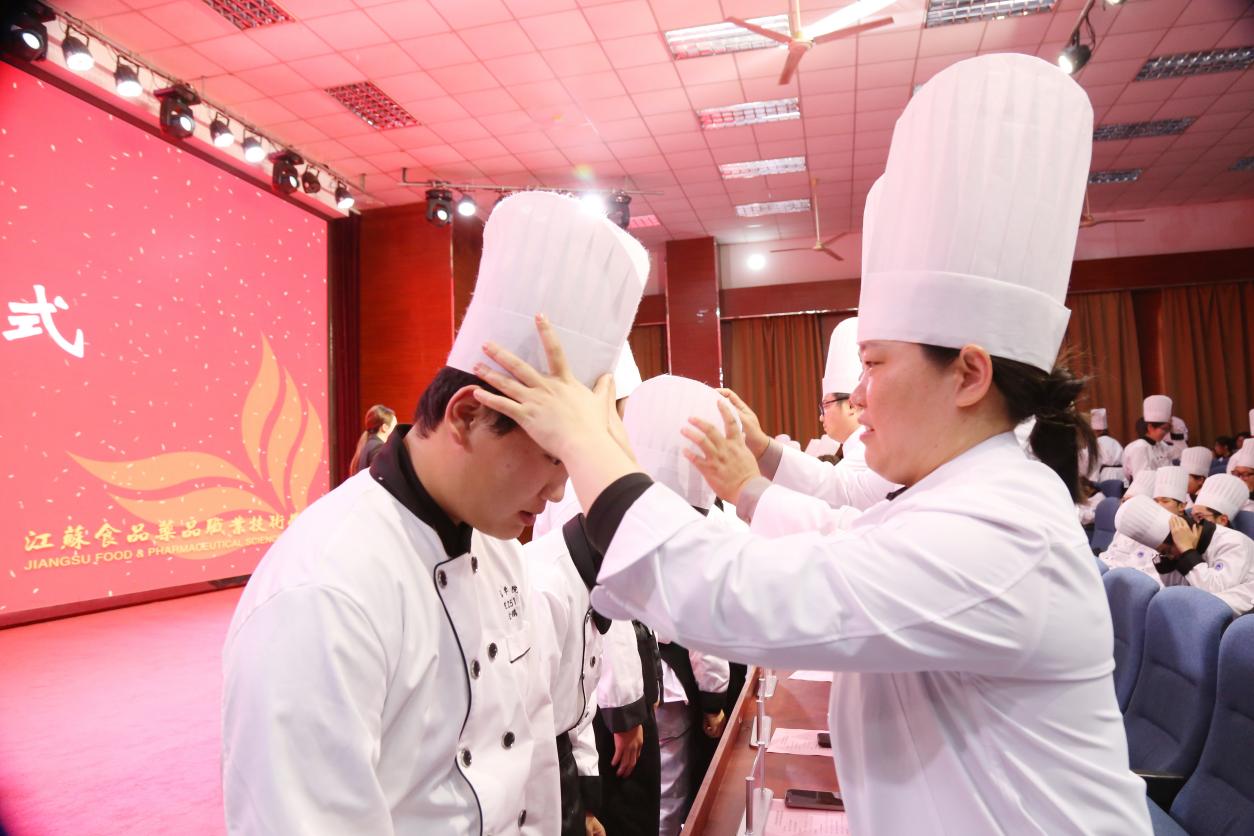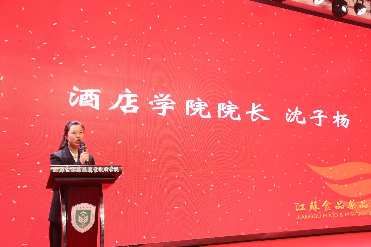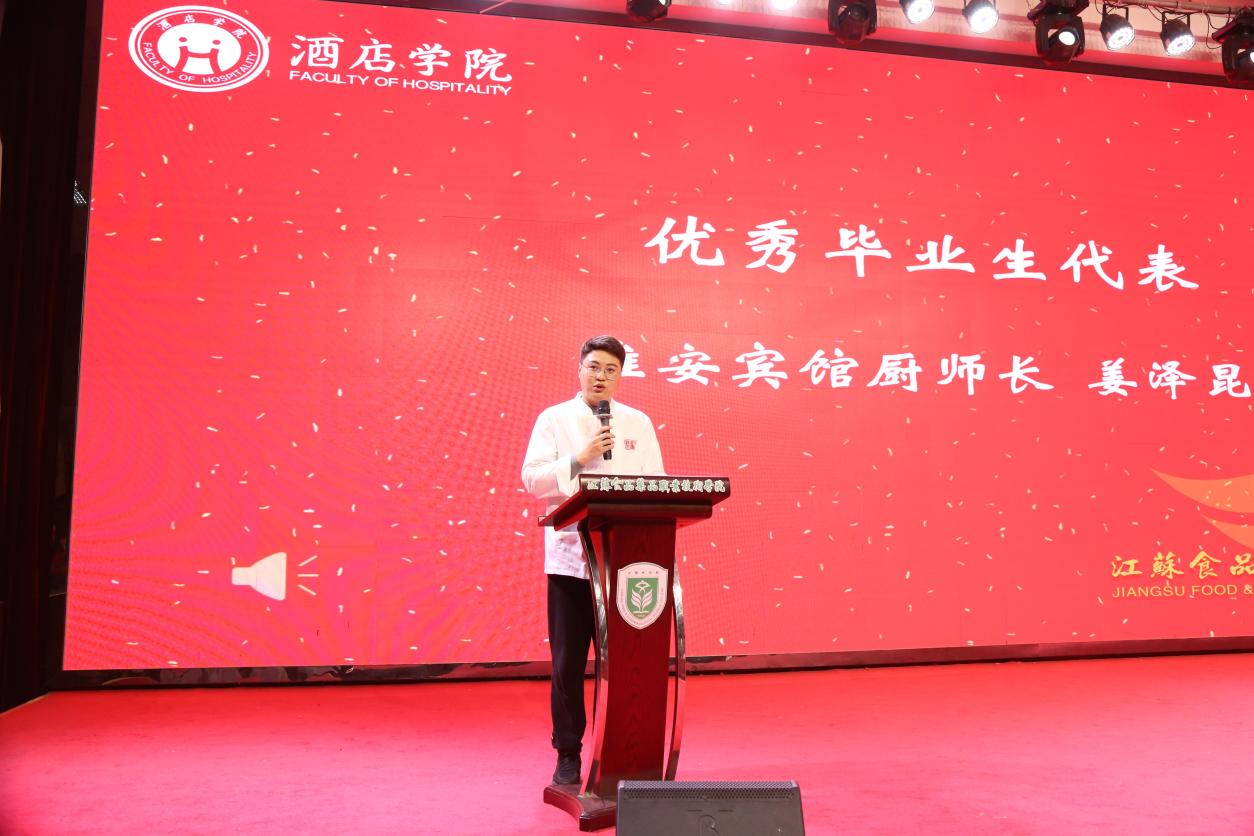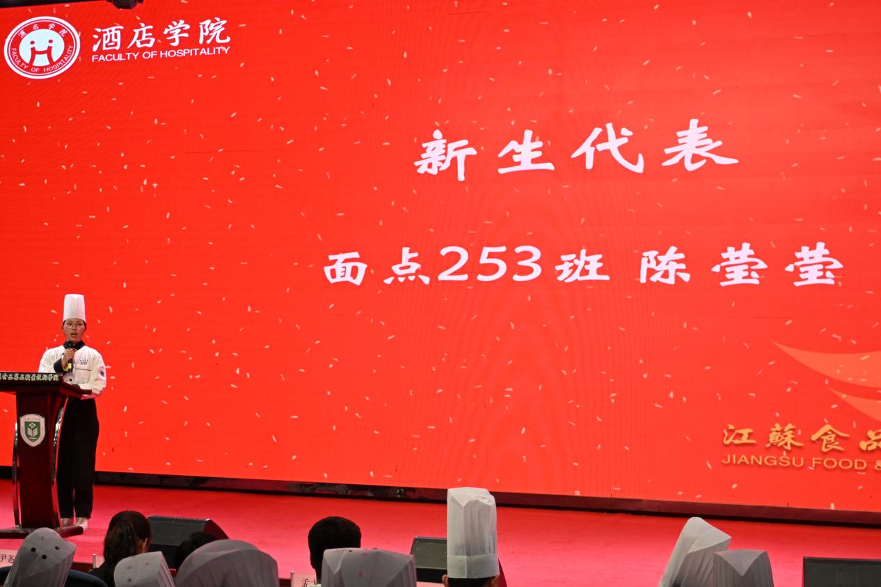 优秀毕业生代表、淮安宾馆厨师长姜泽昆重返母校,深情回顾了在校学习与职场奋斗的历程。他以学长的亲切口吻,鼓励学弟学妹脚踏实地、精进不休。新生代表、面点253班陈莹莹同学则在发言中表达了对专业的热爱与憧憬,展现出新一代烹饪人接续传统、勇于超越的朝气。仪式中还穿插了舞蹈《灯火里的中国》,优美动人的舞姿为庄重的典礼注入了一抹艺术灵动与家国情怀。
