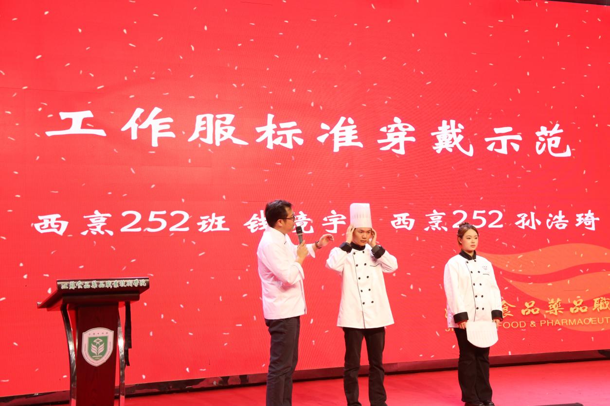 授帽环节在庄严的乐声中展开。酒店学院副院长尹忞强首先进行工作服规范穿戴示范与讲解,西烹252班钱镜宇、孙浩琦两位同学作现场展示,凸显出严谨的职业态度与素养。随后,学院领导及各专业教师逐一为2025级烹饪工艺与营养、中西面点工艺、西式烹饪工艺专业新生授帽。一顶顶洁白的厨师帽被郑重戴上,标志着同学们正式肩负起烹饪人的使命,完成了从在校学子到准职业人的身份转变。