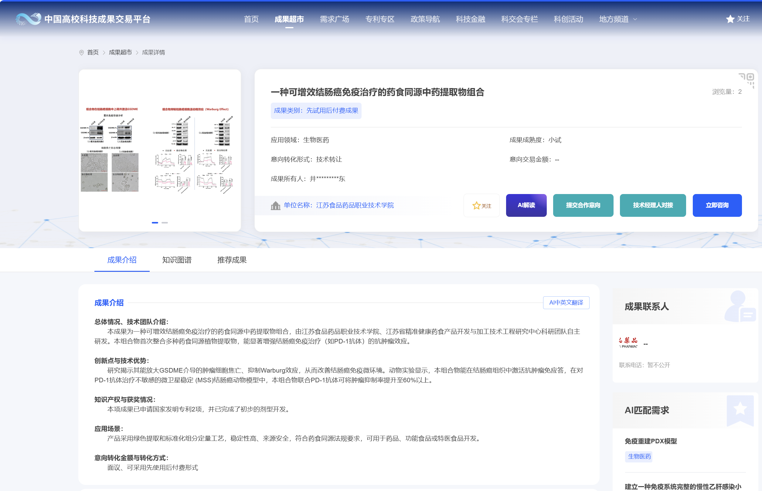 在本届大会中,我校药学院井立佳教授科研成果——“一种可增效结肠癌免疫治疗的药食同源中药提取物组合”顺利通过大会审核并受邀参展,成为736项生物医药类成果中,全国高职院校仅有的两项参展项目之一,充分体现了我校在生物医药领域的科研实力与创新水平。