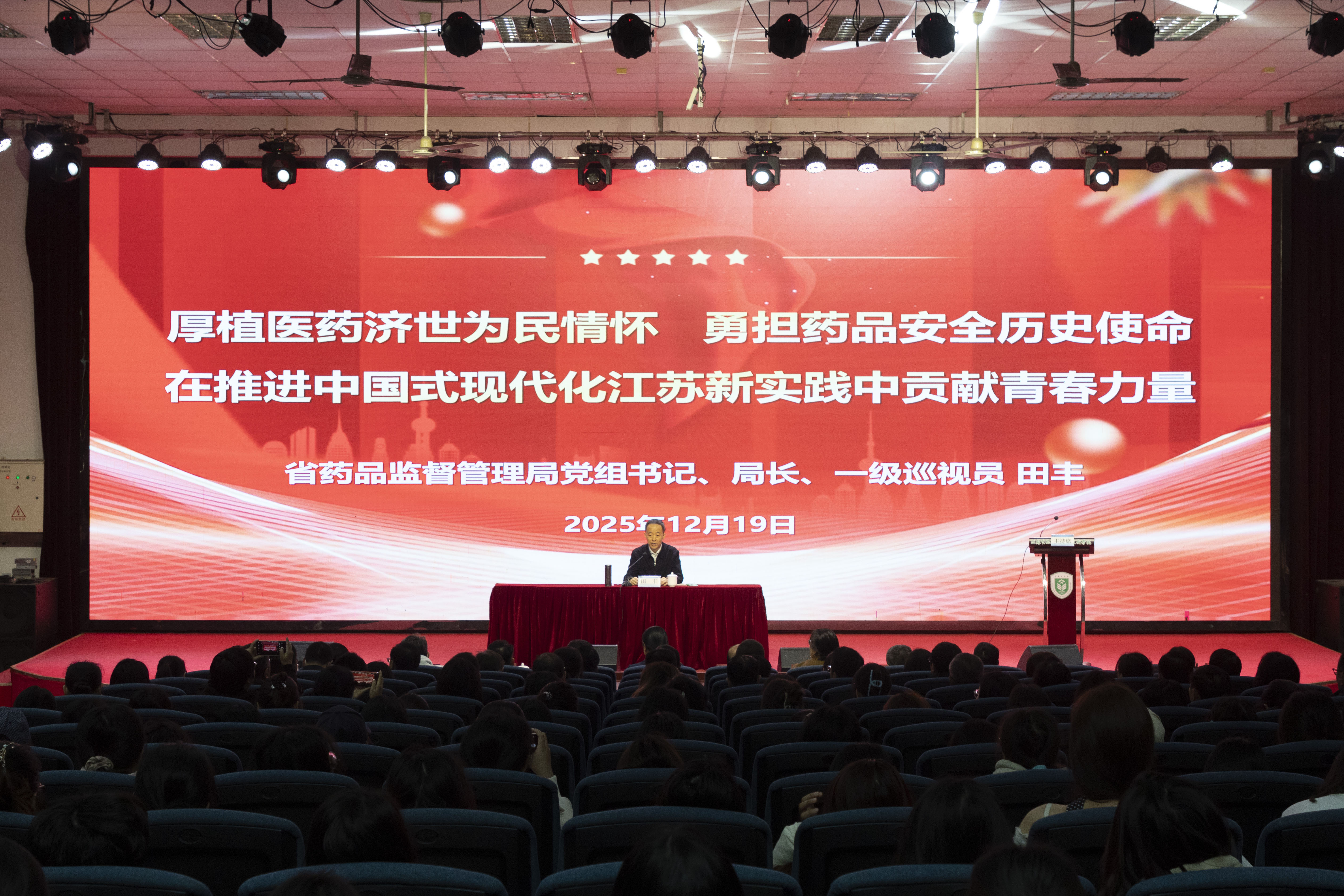 田丰以药品安全与医药发展的历史使命为切入点,向我校学子分享了江苏药监系统推进药品监管现代化方面的创新举措,向同学们作为医药事业新时代接班人提出了希望和建议。田丰表示,新时期新阶段,我国医药产业发展正处于重要战略机遇期,“十四五”以来,我省产业规模居全国第一、创新能力全国领先、产业集群特色明显、国际化发展前景广阔、产业生态持续优化。药品安全事关人民群众生命健康,事关社会稳定和国家战略安全,在这一领域工作,既要有精湛的专业技能,更要有坚定的政治立场和强烈的责任担当。同学们要肩负的不仅是个人职业发展的责任,更是守护人民健康的神圣使命。田丰强调,一切监管工作都要以保障人民群众用药安全、促进公众健康为根本目的。在坚守安全底线的前提下,要通过制度创新、科技创新、模式创新不断提升监管效能,驱动产业发展。要聚焦国际视野,对标国际先进水平,推动江苏医药产业更好地参与国际竞争与合作。田丰希望,同学们作为医药领域的新生力量能够坚定理想信念、练就过硬本领,充分认识自身的兴趣、特长与优势,结合专业学习成果,选择最适合自己的职业方向,更加坚定地走好未来的职业道路。省药监局也将持续加强与我校的合作,为同学们提供更多实践平台。他热忱欢迎同学们学成后加入江苏药监事业,共同守护人民群众用药安全,促进医药产业高质量发展。