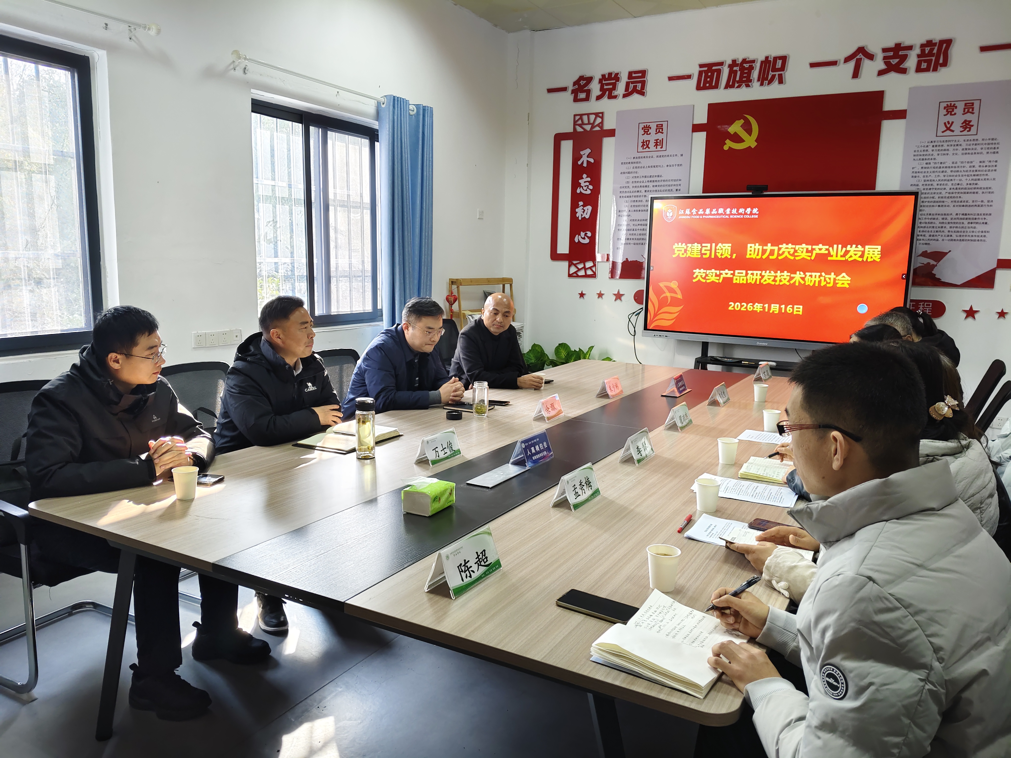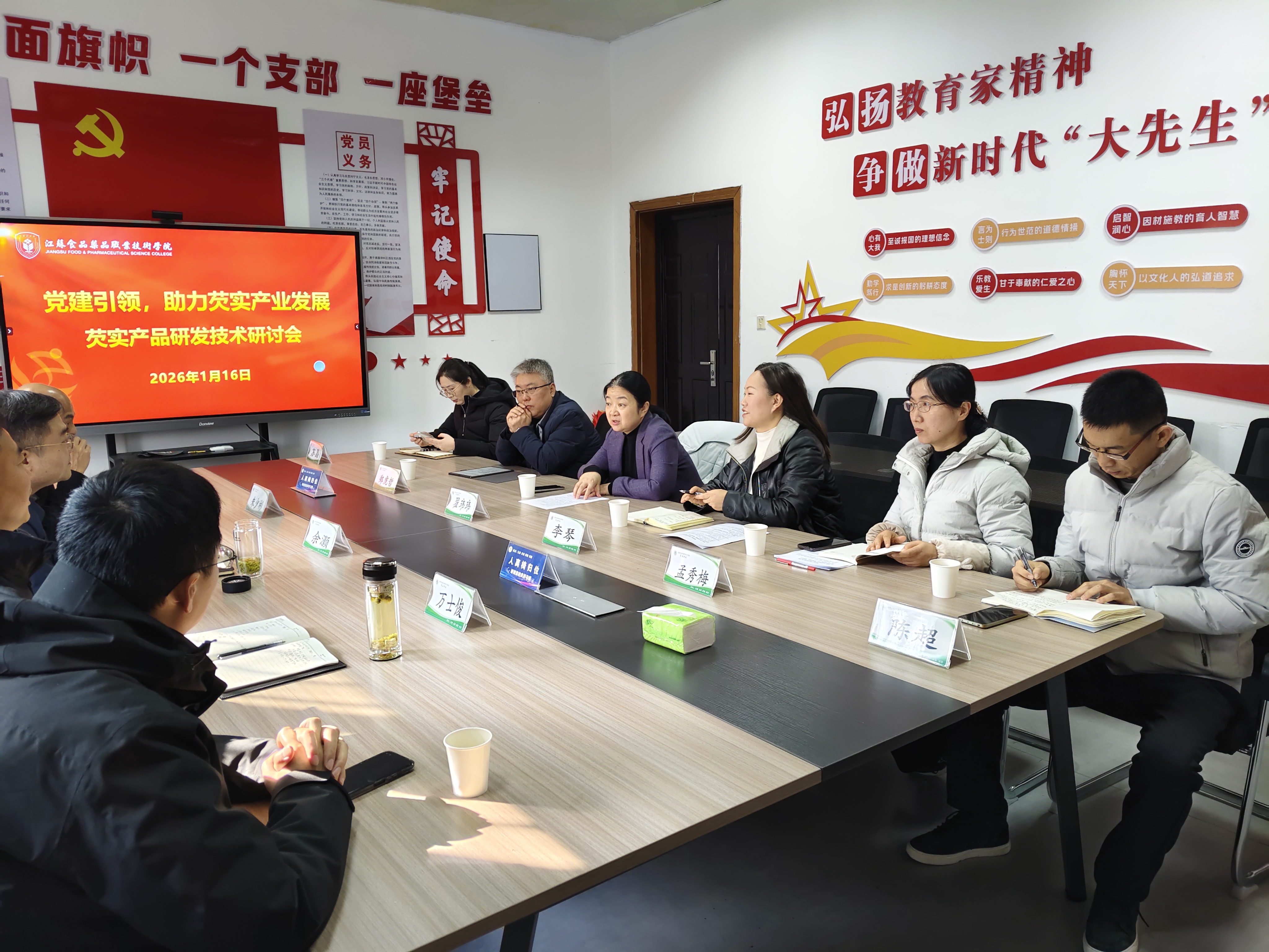 1月16日,芡实产品研发技术研讨会在食品学院216会议室召开。淮安市淮安区委副书记余灏、车桥镇党委副书记万士俊、淮安千润农业科技有限责任公司总经理朱少彬,我校党委书记翟玮玮出席会议,会议由食品学院党总支书记李琴主持。