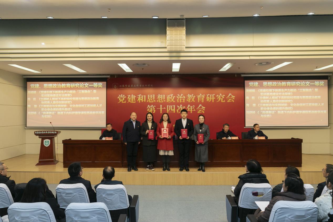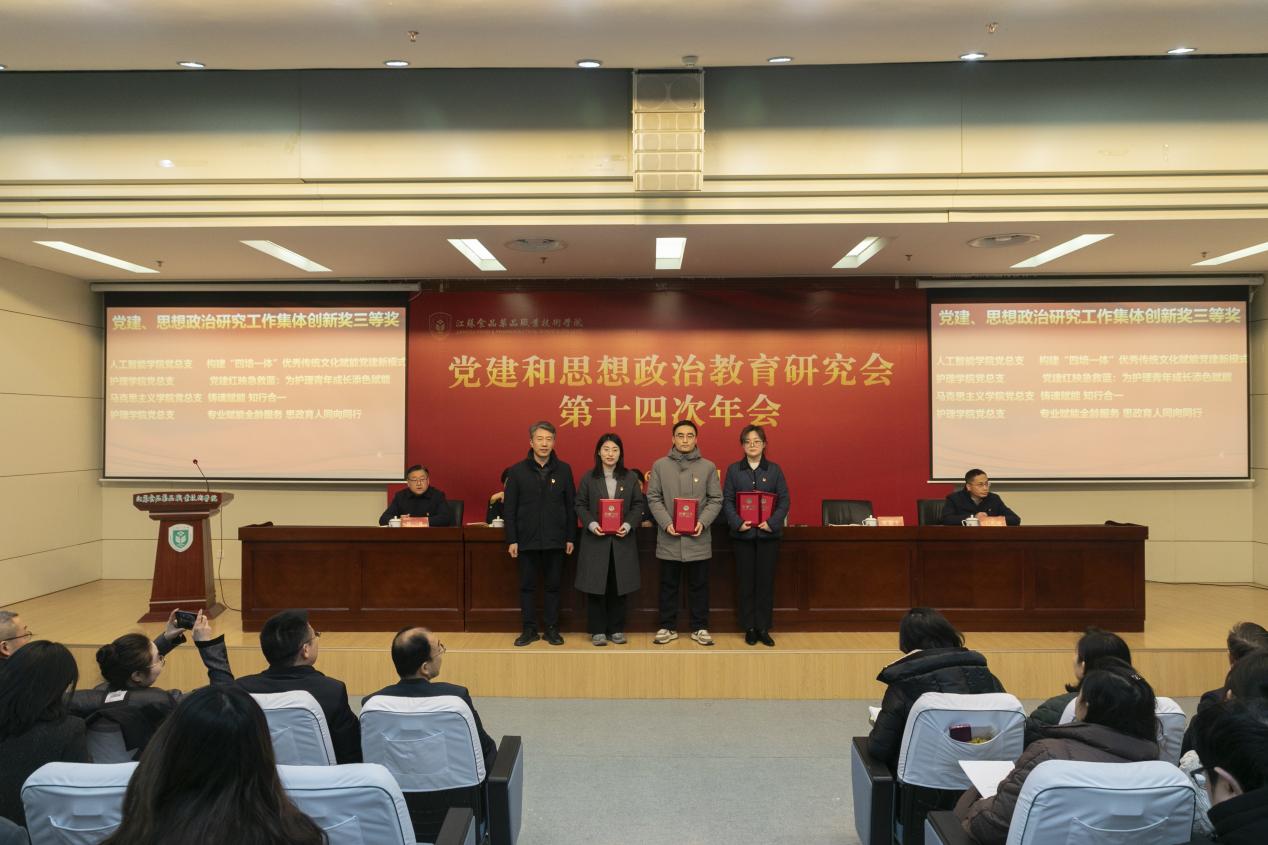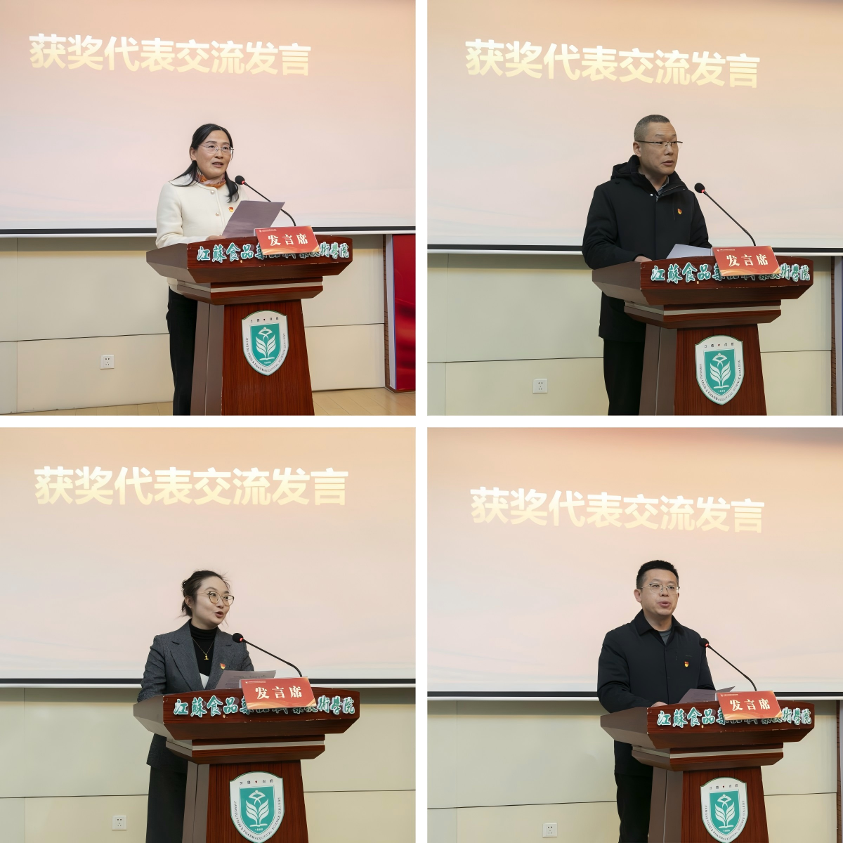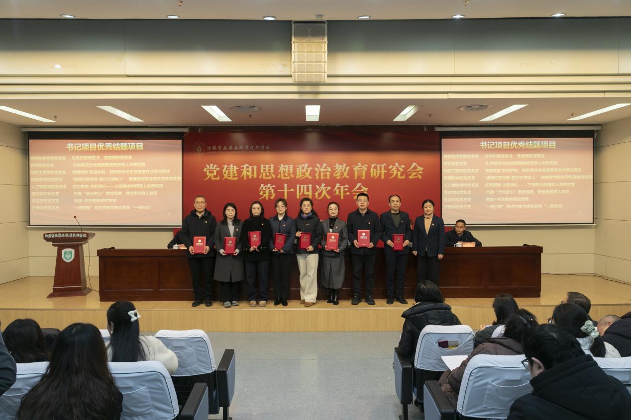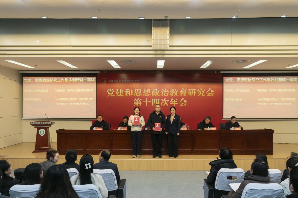 首先,安进校长报告年会筹备情况,并宣读表彰决定。全体与会领导为党建思政获奖论文、党建思政集体创新奖、书记项目优秀结题项目颁发荣誉证书。随后马克思主义学院党总支书记李乐霞、酒店学院党总支书记拾以超、智能制造学院党总支书记龙婧婧、制药工程学院党总支书记朱劲松作交流发言。