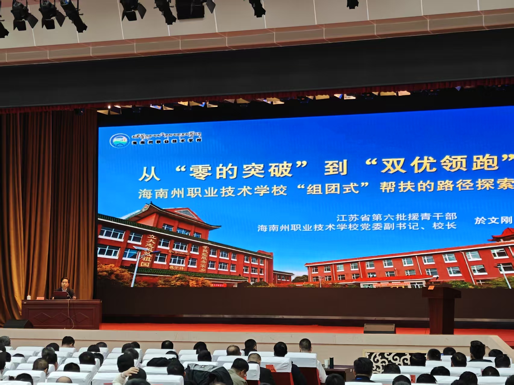 本次培训班汇聚了全国524名援青干部人才、东西部协作帮扶干部及博士服务团成员。於文刚以《从“零的突破”到“双优领跑”:海南州职业技术学校“组团式”帮扶的路径探索》为题,系统分享了入青以来推动海南州职业技术学校实现跨越式发展的实践路径。我校将继续支持援青干部人才聚焦立德树人根本任务,深化“组团式”帮扶内涵,为推进区域协调发展、铸牢中华民族共同体意识持续贡献江苏教育力量。
