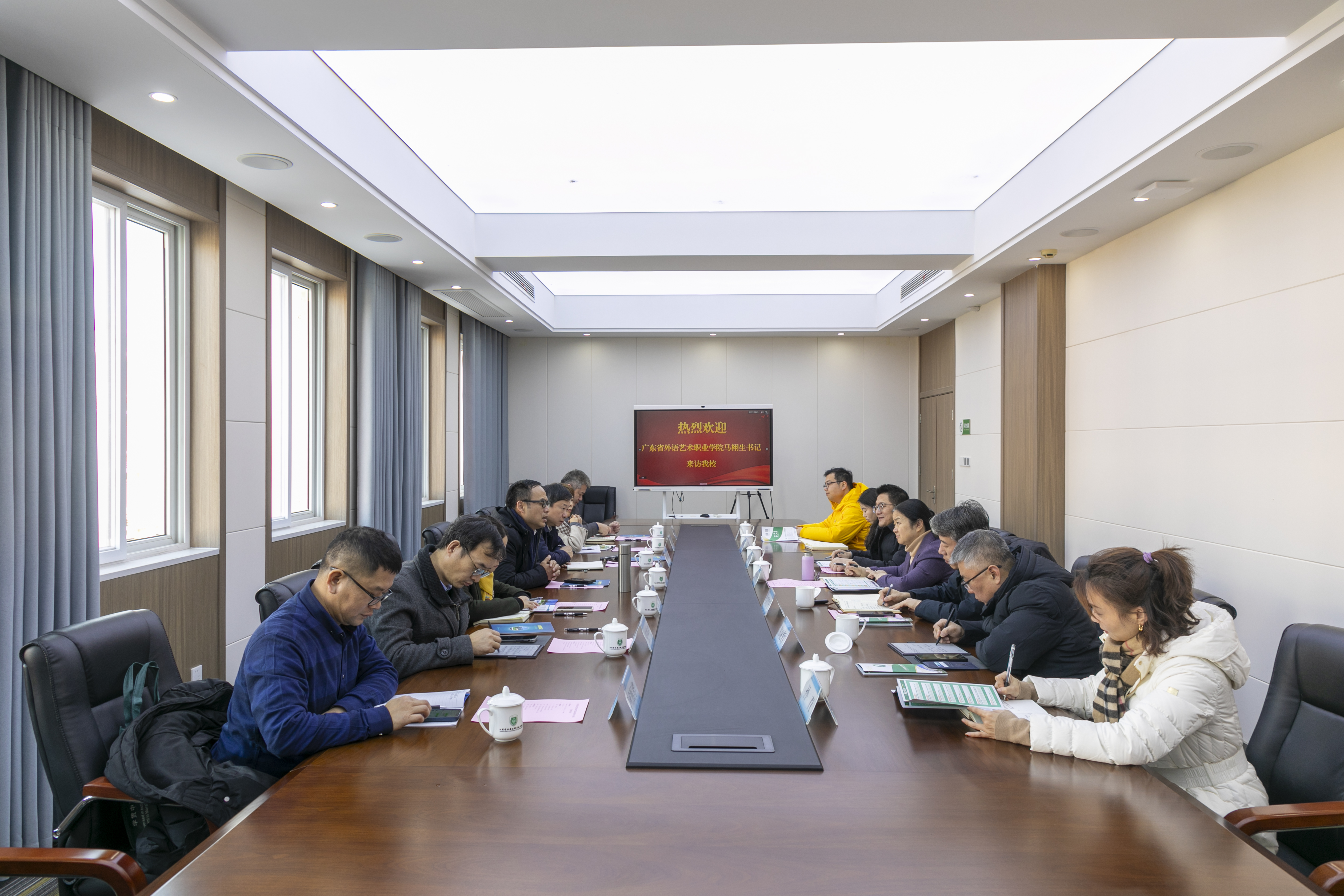 1月21日,广东省外语艺术职业学院党委书记马栩生、副校长袁洪一行来校调研交流,我校党委书记翟玮玮、副校长贾韶千接待来宾并共同出席会议。