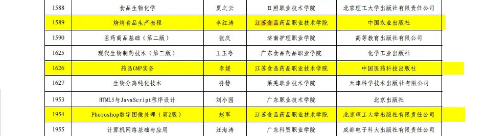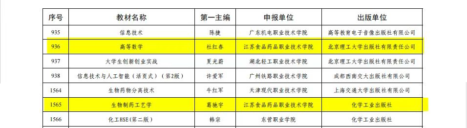 近日,教育部办公厅公布了第二批“十四五”职业教育国家规划教材书目,我校《高等数学》(第一主编:杜红春)、《生物制药工艺学》(第一主编:葛驰宇)、《焙烤食品生产教程》(第一主编:李红涛)、《药品GMP实务》(第一主编:李媛)、《Photoshop数字图像处理(第2版)》(第一主编:赵军)共5本教材拟入选。