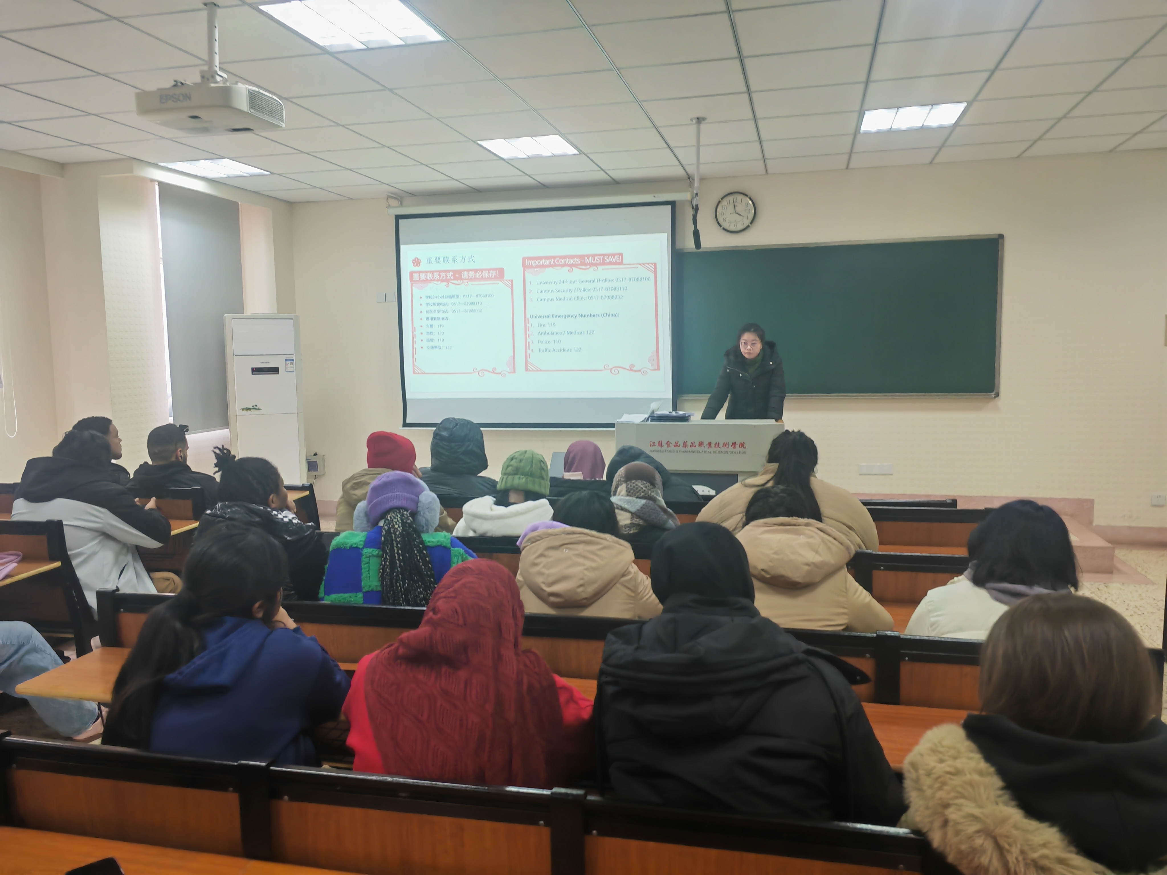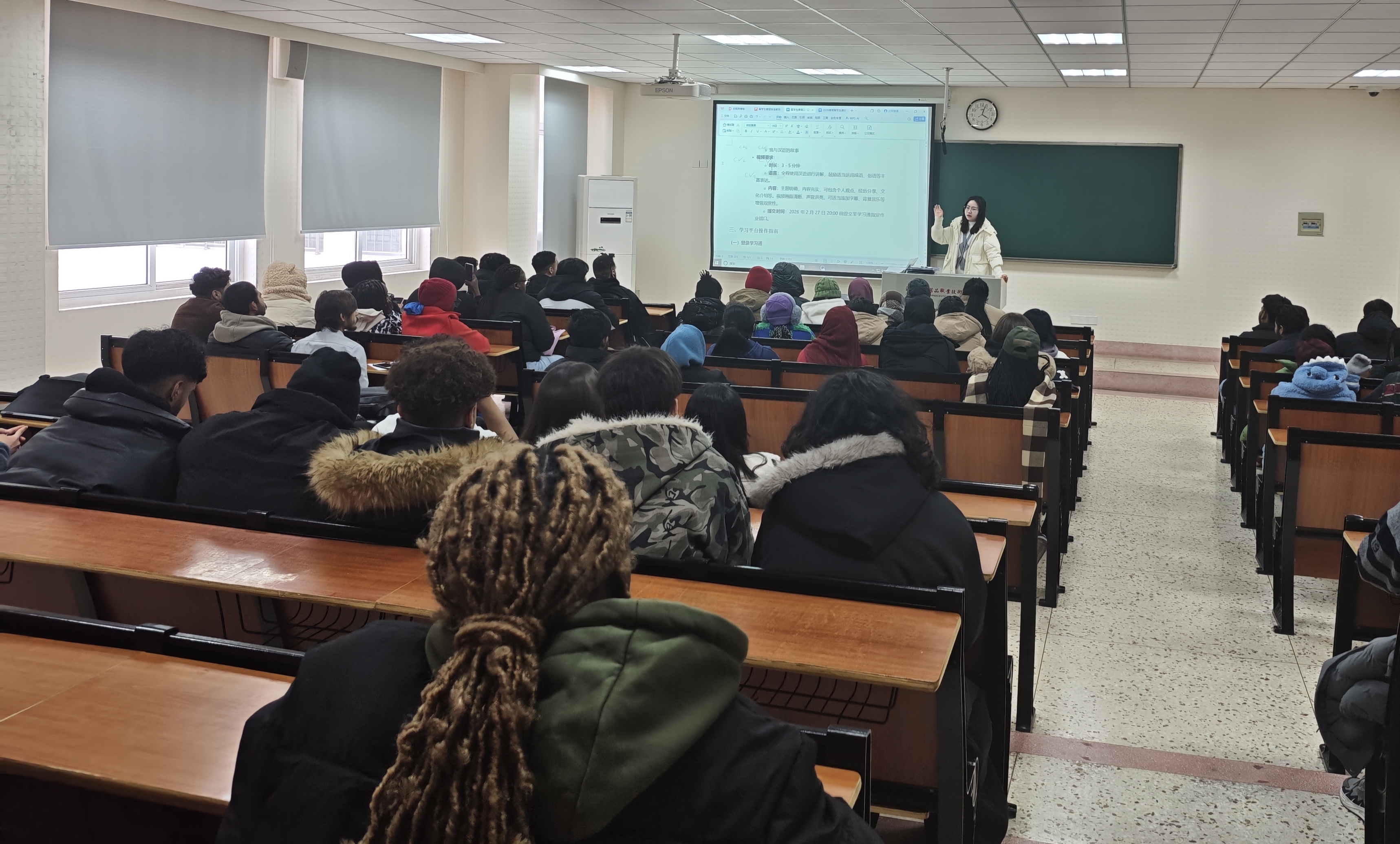 刘姝老师围绕寒假期间的学习与实践安排进行了详细说明。她首先介绍了“留学生寒假汉语学习强化方案”,鼓励同学们在假期保持学习连续性,积极利用各类资源提升汉语能力;接着她重点阐述了“2026年寒假留学生淮安文化探访实践作业方案”,她鼓励同学们在保障安全的前提下,利用假期深入探索淮安的历史文化与风土人情,通过小组合作的方式,在实践中增进交流、提升汉语应用能力,并进一步熟悉和融入本地生活。
