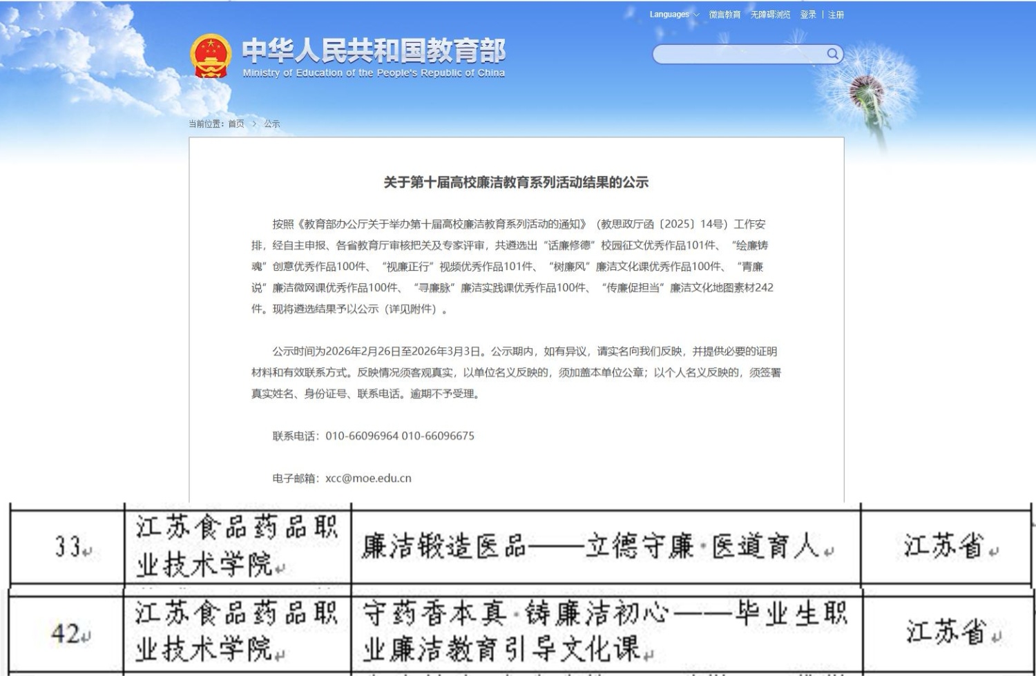 近日,教育部公布第十届高校廉洁教育系列活动评选结果,我校喜获佳绩,申报的两部作品均获评全国优秀作品,其中《廉洁锻造医品——立德守廉医道育人》入选“视廉正行”视频类优秀作品,《守药香本真铸廉洁初心——毕业生职业廉洁教育引导文化课》入选“树廉风”廉洁文化课类优秀作品。
