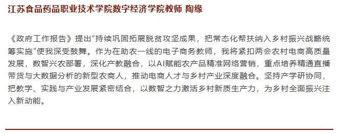 《政府工作报告》提出“持续巩固拓展脱贫攻坚成果,把常态化帮扶纳入乡村振兴战略统筹实施”使我深受鼓舞。作为在助农一线的电子商务教师,我将紧扣两会农村电商高质量发展,数智兴农部署,深化产教融合,以AI赋能农产品精准网络营销,重点培养精通直播带货与大数据分析的新型农商人,推动电商人才与乡村产业深度融合。坚持产学研协同,把教学、实践与产业发展紧密结合,以数智之力激活乡村新质生产力,为乡村全面振兴注入新动能。