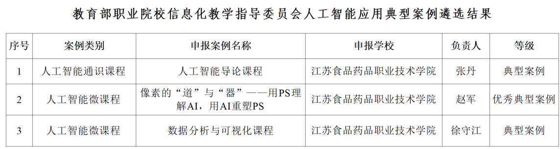 近期,教育部职业院校信息化教学指导委员会共遴选“人工智能通识课程典型案例”“人工智能微课程典型案例”和“人工智能应用场景典型案例”三类典型案例570个。我校人工智能学院申报的《人工智能导论课程》、《像素的“道”与“器”——用PS理解AI,用AI重塑PS》和《数据分析与可视化课程》顺利入选。